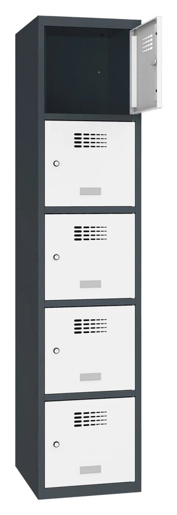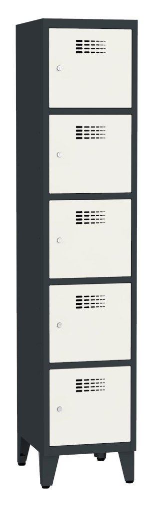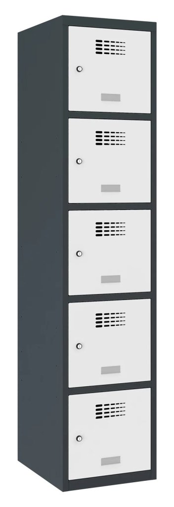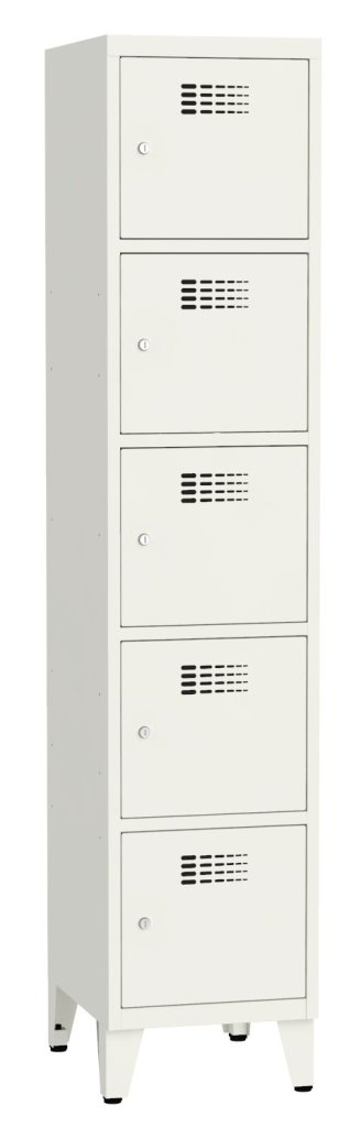 Szafka pięciodrzwiowa o konstrukcji spawanej z nowoczesnym systemem wentylacji. Wysokość 1800 x szerokość 400 x głębokość 500 mm. Samoprzylepna plakietka imienna na drzwiach. Do wyboru 16 odcieni kolorów. Zamek bębenkowy lub zamknięcie na kłódkę.