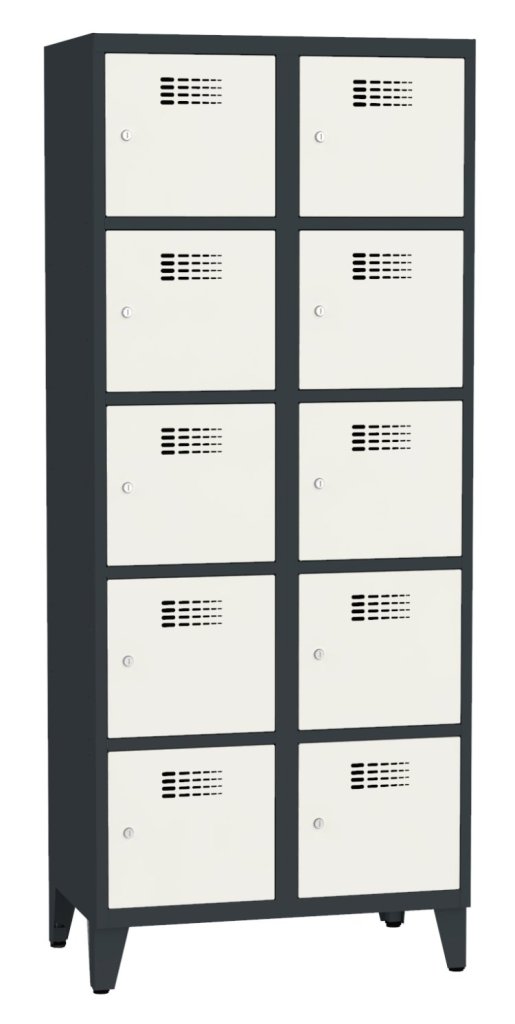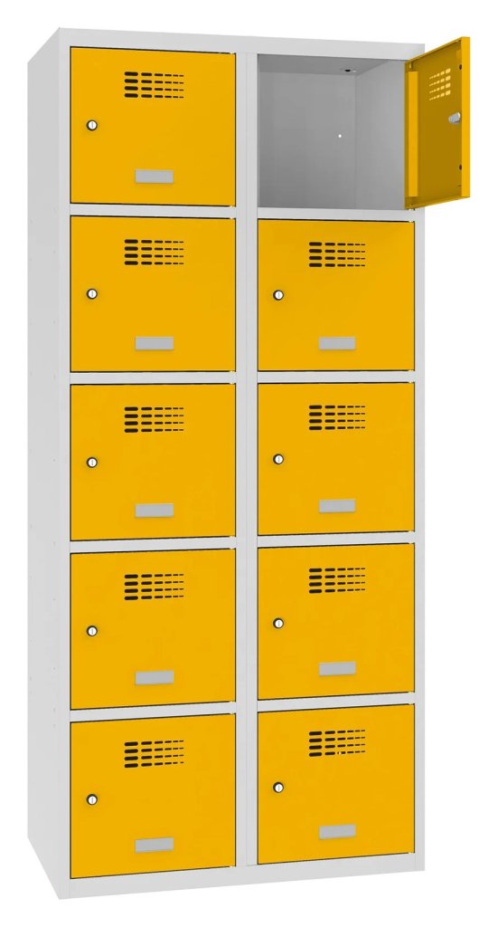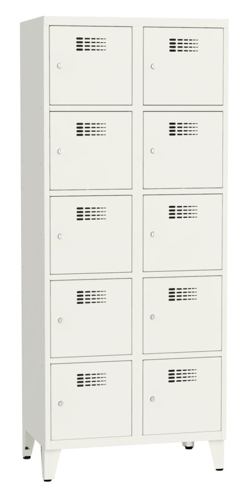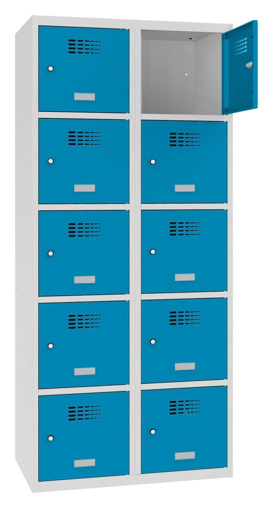 Szafka dziesięciodrzwiowa o konstrukcji spawanej z nowoczesnym systemem wentylacji. Wysokość 1800 x szerokość 800 x głębokość 500 mm. Samoprzylepna plakietka imienna na drzwiach. Do wyboru 16 odcieni kolorów. Zamek bębenkowy lub zamknięcie na kłódkę.