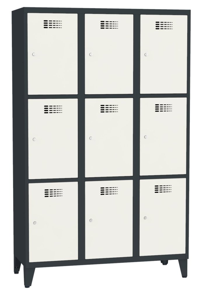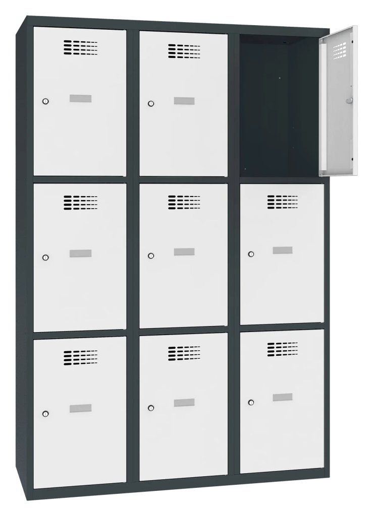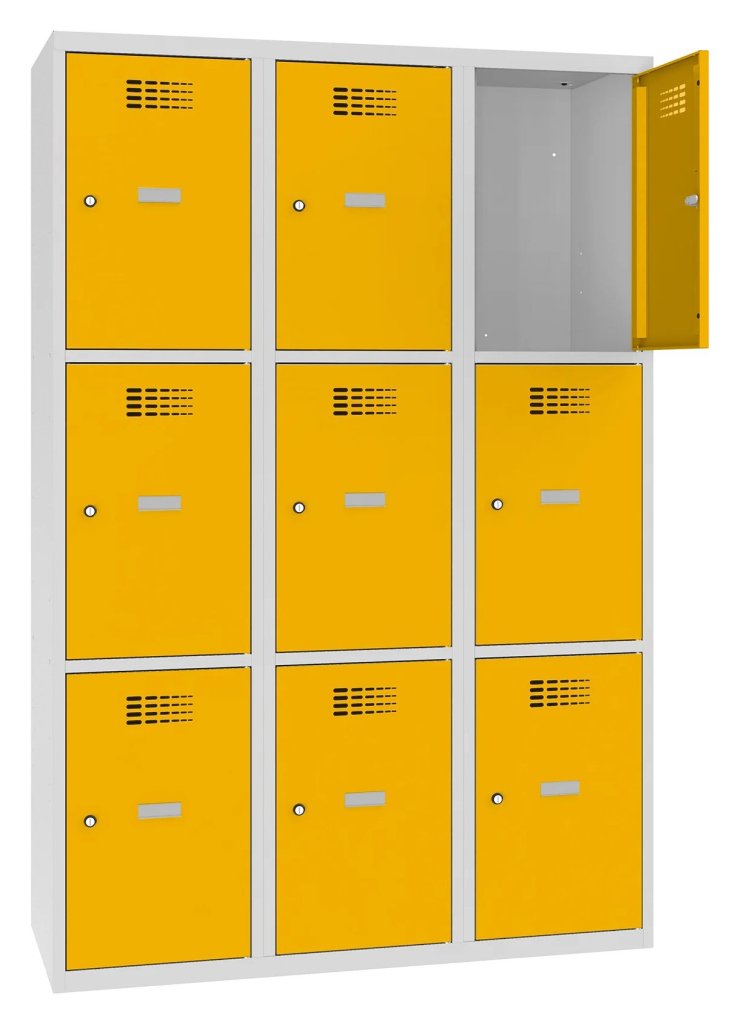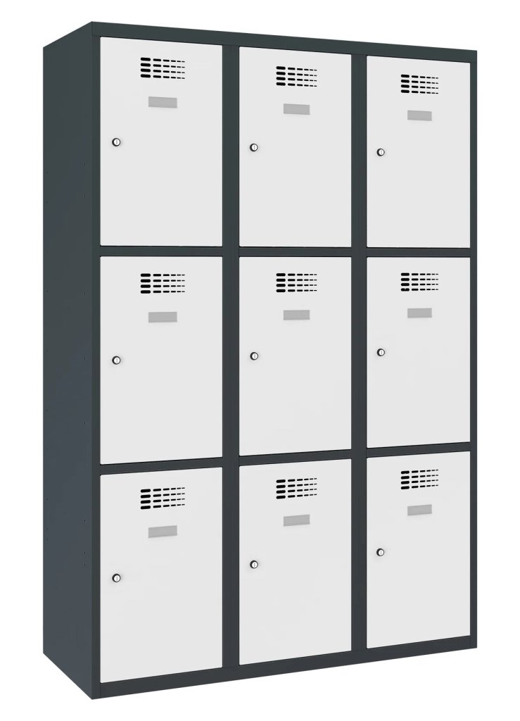 Szafka dziewięciodrzwiowa o konstrukcji spawanej z nowoczesnym systemem wentylacji. Wysokość 1800 x szerokość 1200 x głębokość 500 mm. Samoprzylepna plakietka imienna na drzwiach. Do wyboru 16 odcieni kolorów. Zamek bębenkowy lub zamknięcie na kłódkę.