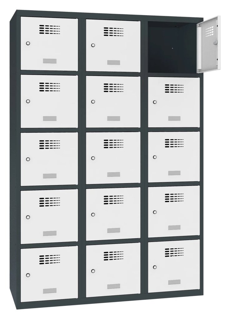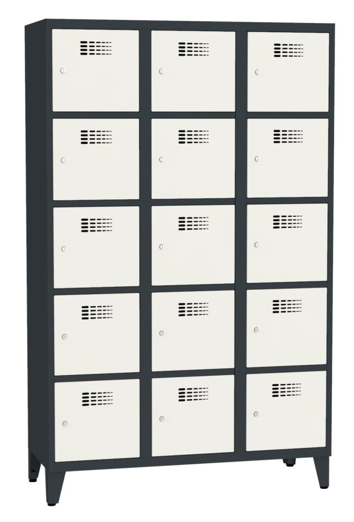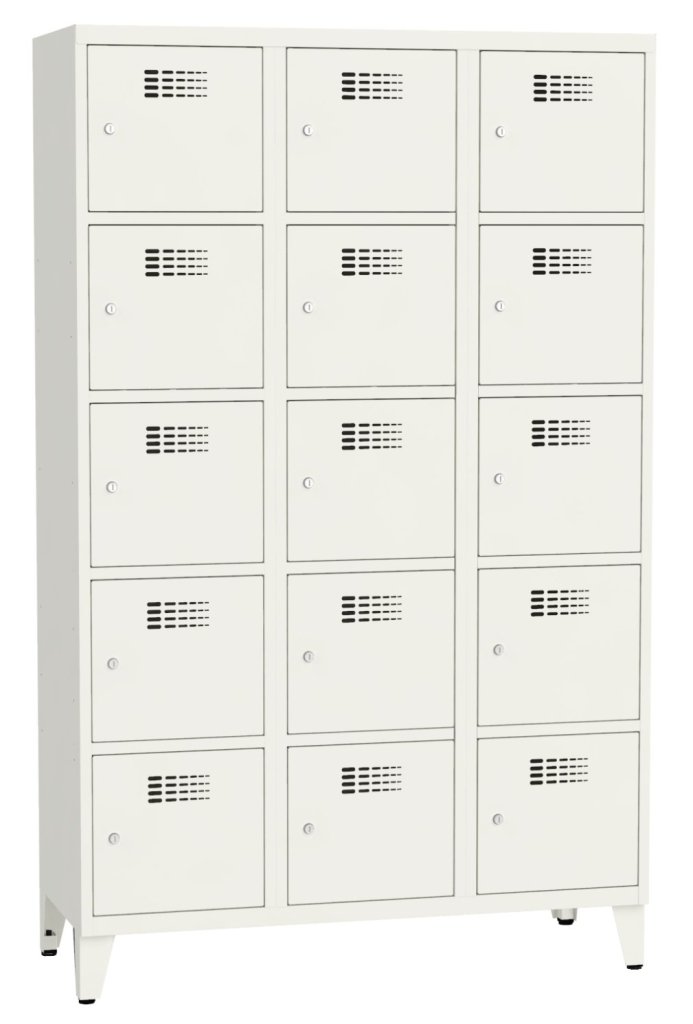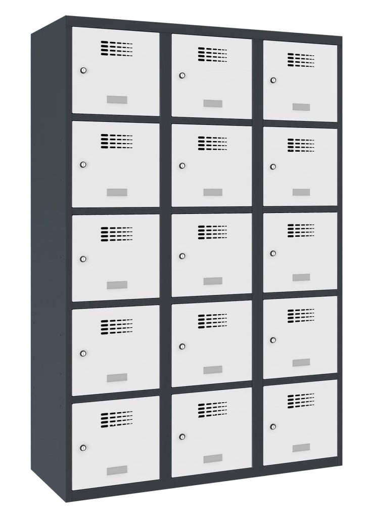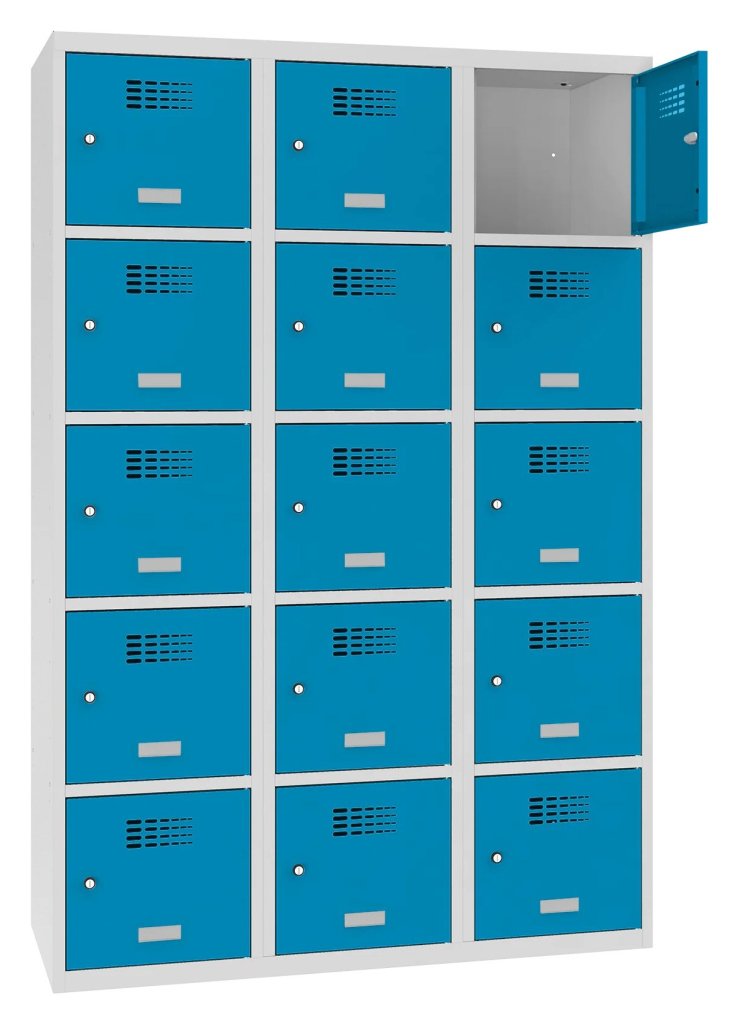 Szafka piętnastodrzwiowa o konstrukcji spawanej z nowoczesnym systemem wentylacji. Wysokość 1800 x szerokość 1200 x głębokość 500 mm. Samoprzylepna plakietka imienna na drzwiach. Do wyboru 16 odcieni kolorów. Zamek bębenkowy lub zamknięcie na kłódkę.