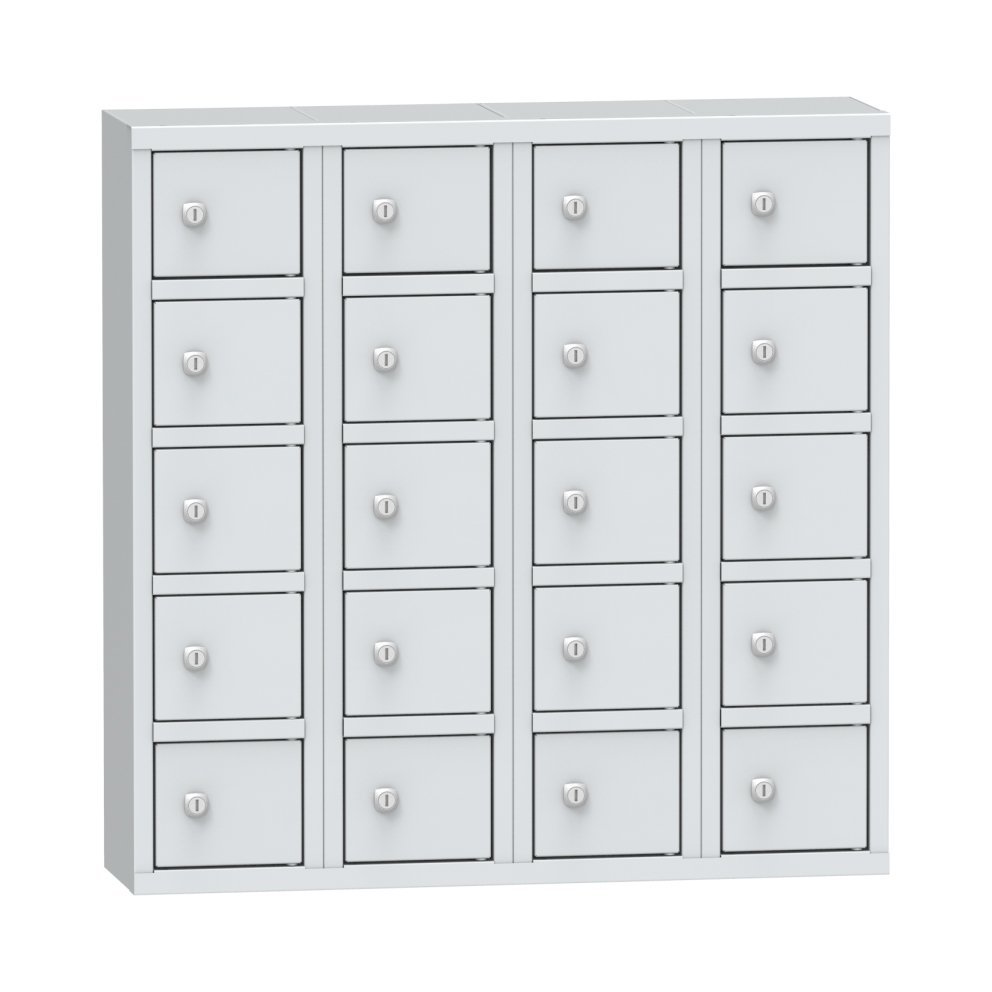 Szafka metalowa ze schowkami przeznaczona jest do przechowywania rzeczy osobistych oraz przedmiotów wartościowych o mniejszych gabarytach. Wymiary wys. 780 x szer. 780 x gł. 200 mm, 20 schowków.