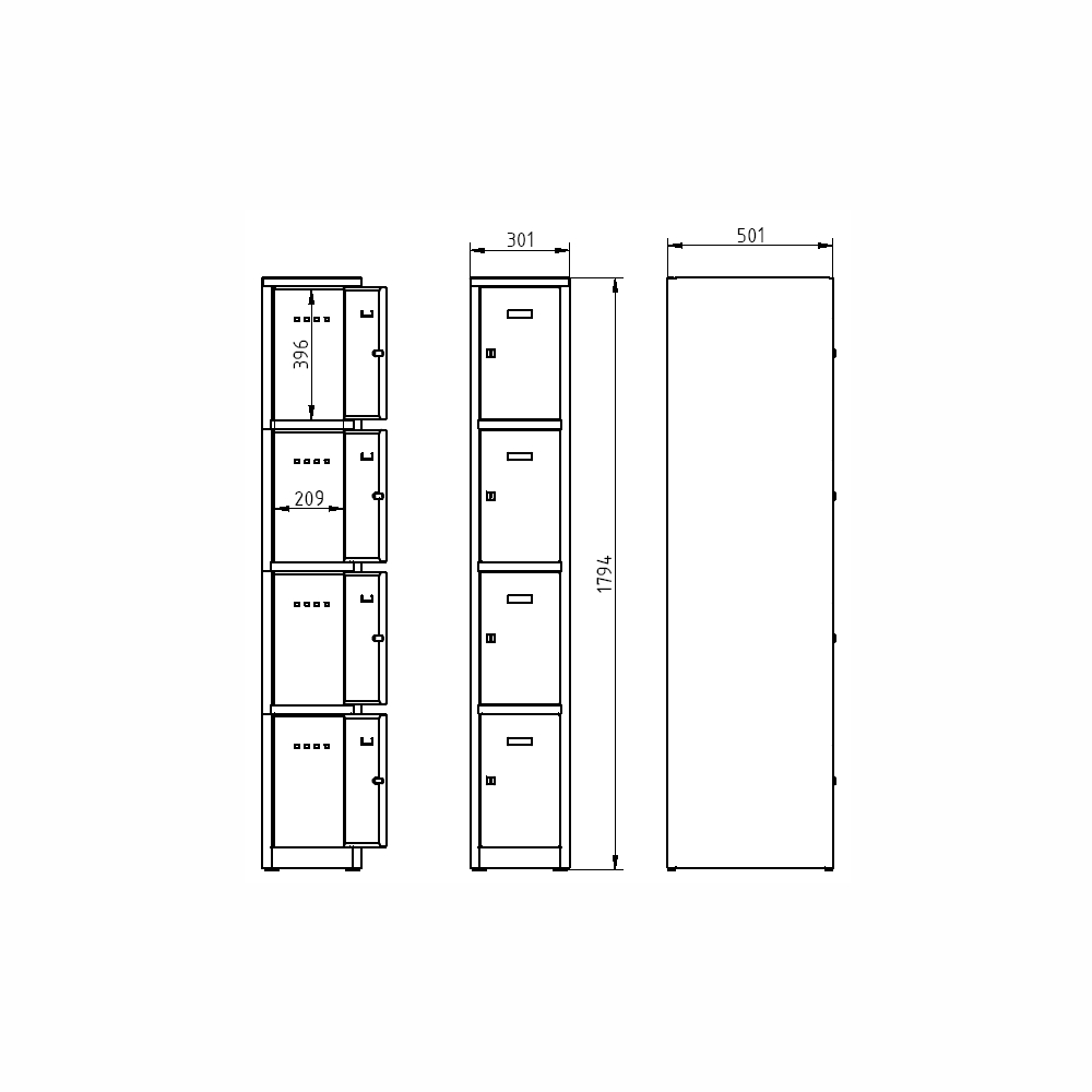 Szafa metalowa z zamykanymi schowkami, wysokość 1800 x szerokość 300 x głębokość 500 mm. Zamknięcie na klucz lub kłódkę. Kolor korpusu RAL 7035 jasnoszary.