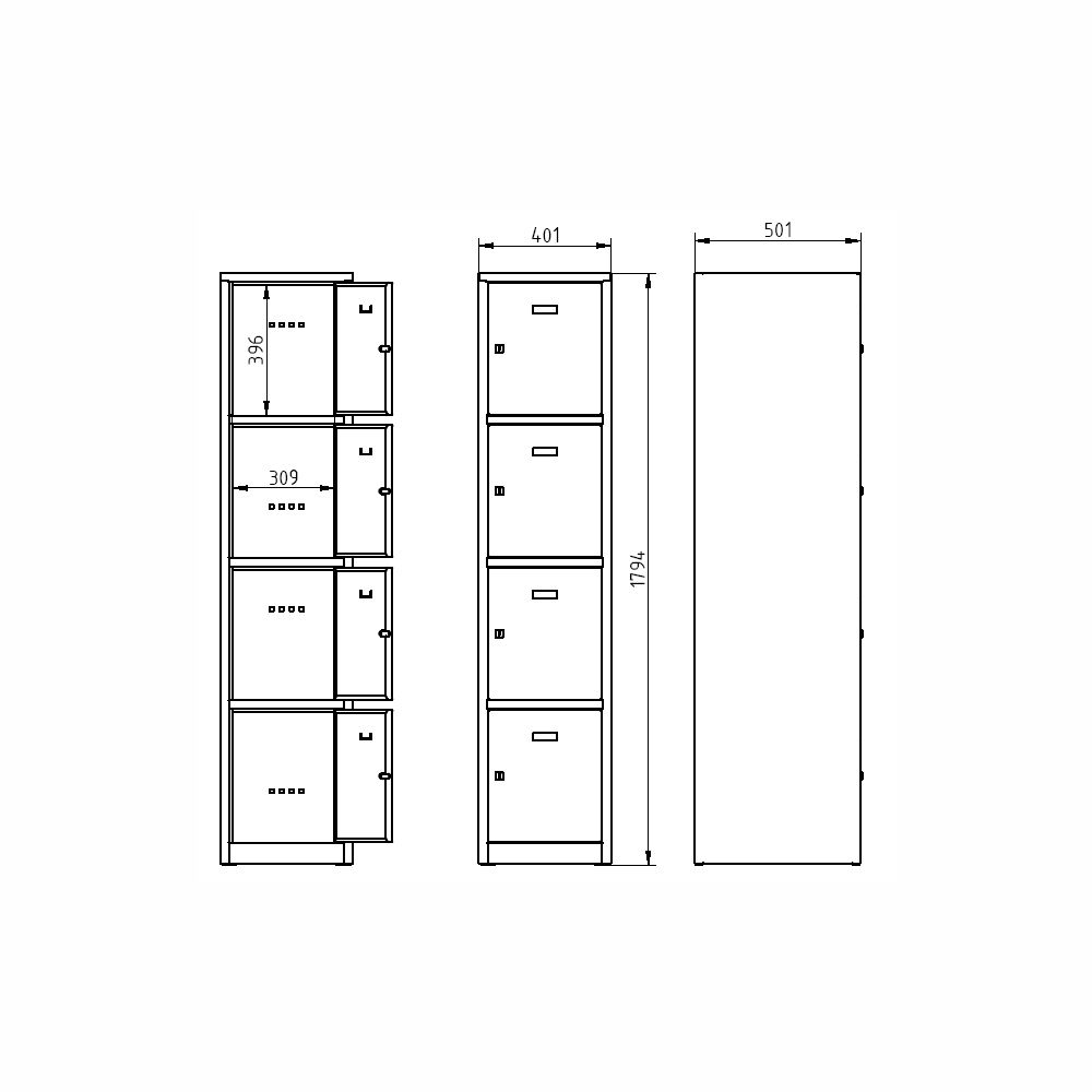 Szafka metalowa z zamykanymi schowkami, wysokość 1800 x szerokość 300 x głębokość 500 mm. Zamknięcie na klucz lub kłódkę. Kolor korpusu RAL 7035 jasnoszary.