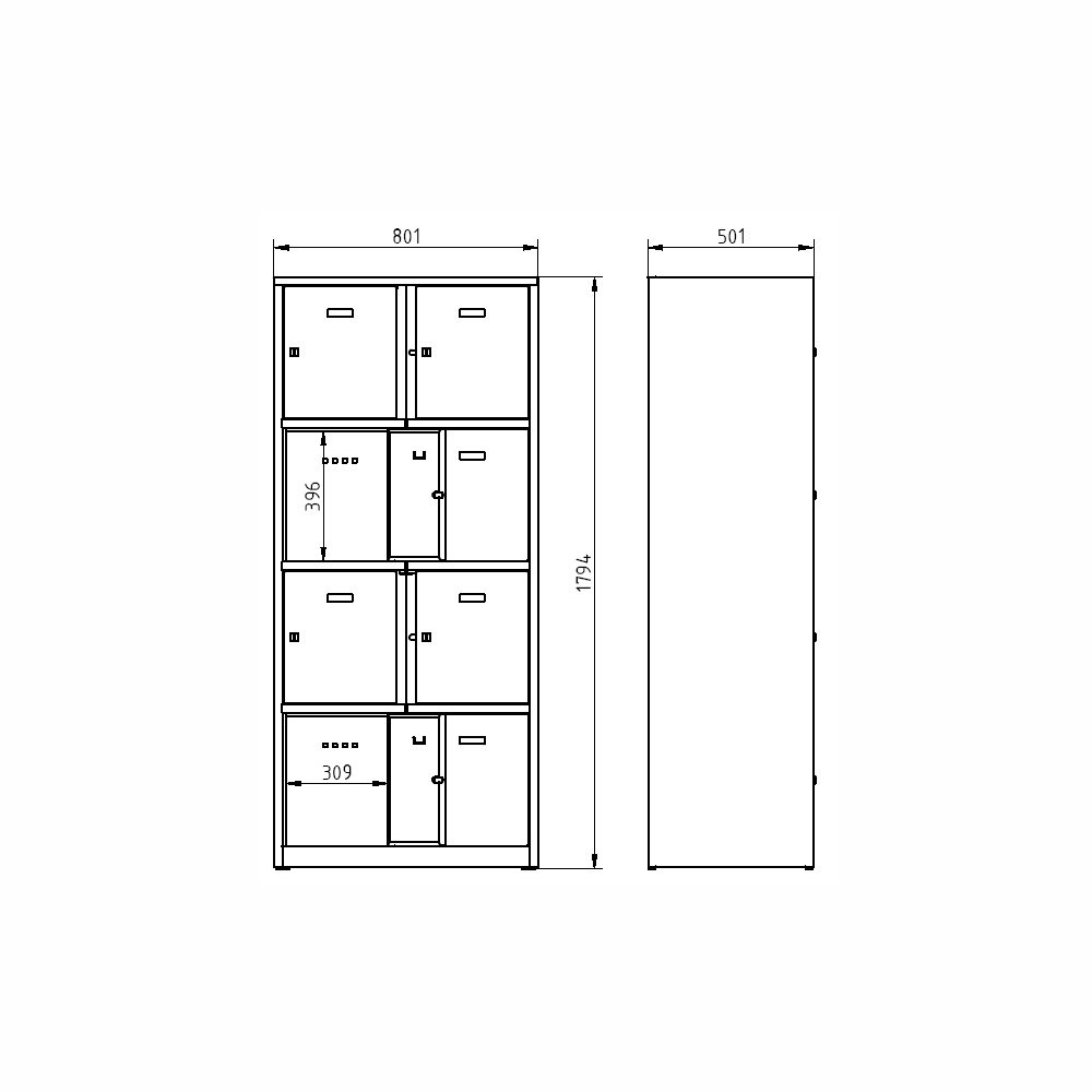 Szafa metalowa z zamykanymi schowkami, wysokość 1800 x szerokość 400 x głębokość 500 mm. Zamknięcie na klucz lub kłódkę. Kolor korpusu RAL 7035 jasnoszary.