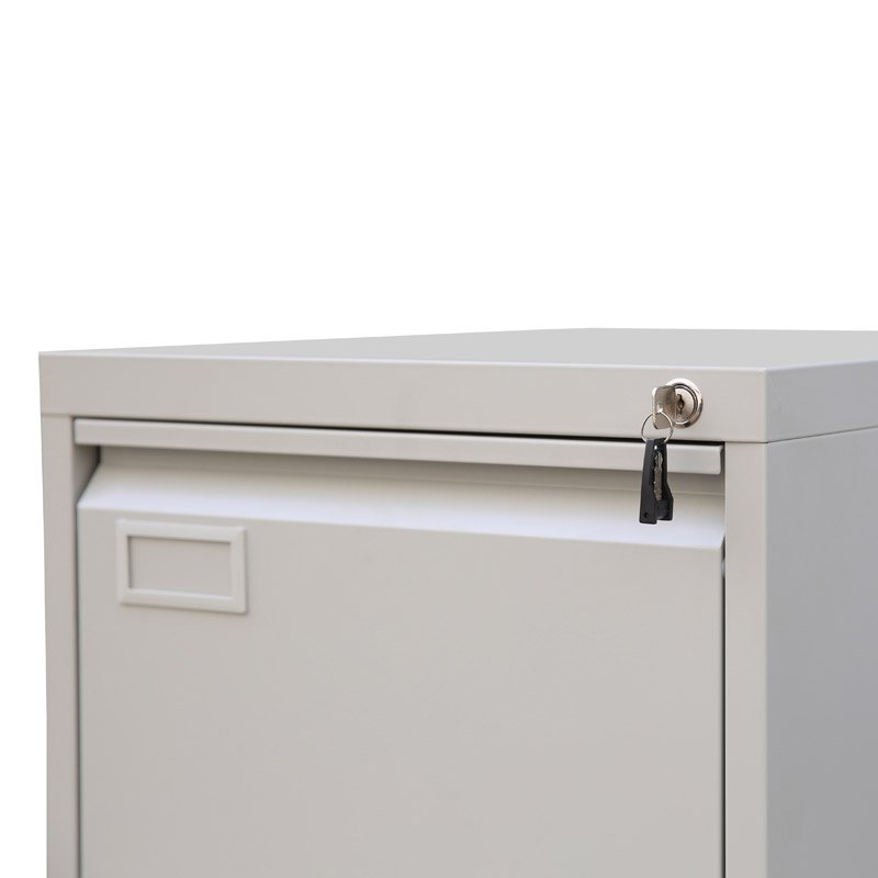 Dwuszufladowa szafka na dokumenty, montaż według instukcji, wykonana z blachy stalowej o grubości 0,6 mm. Wysokość 720 x szerokość 460 x głębokość 620 mm, zamek centralny, pełny wysuw szuflad. Na dokumenty lub segregatory wiszące formatu A4. Kolor szary RAL 7035.