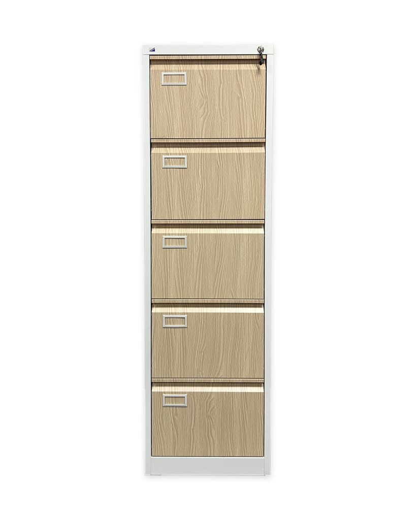 Szafka na dokumenty do samodzielnego montażu z pięcioma szufladami, wykonana z blachy stalowej o grubości 0,6 mm. Wysokość 1620 x szerokość 460 x głębokość 620 mm, zamek centralny, pełny wysuw szuflad. Na dokumenty lub segregatory wiszące w formacie A4. Kolor szary RAL 7035.