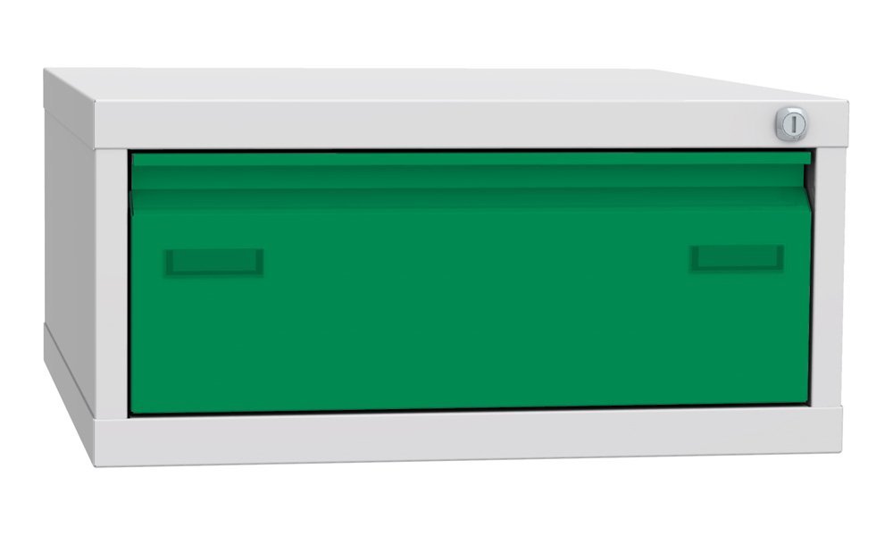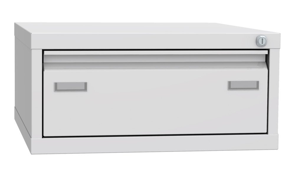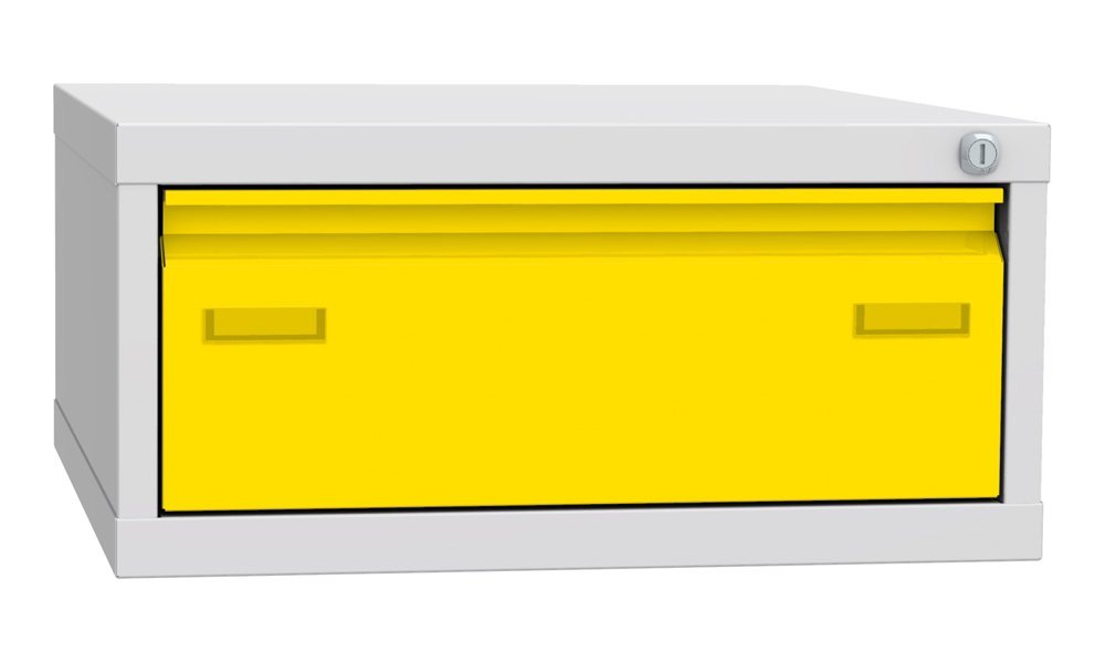 Szafka na dokumenty w formacie A5. Pojedyncza szuflada (w szufladzie znajdują się 2 przegródki). Wysokość 265 x szerokość 560 x głębokość 600 mm. Korpus metalowy w kolorze jasnoszarym RAL 7035, szuflada w różnych kolorach, zamek bębenkowy.