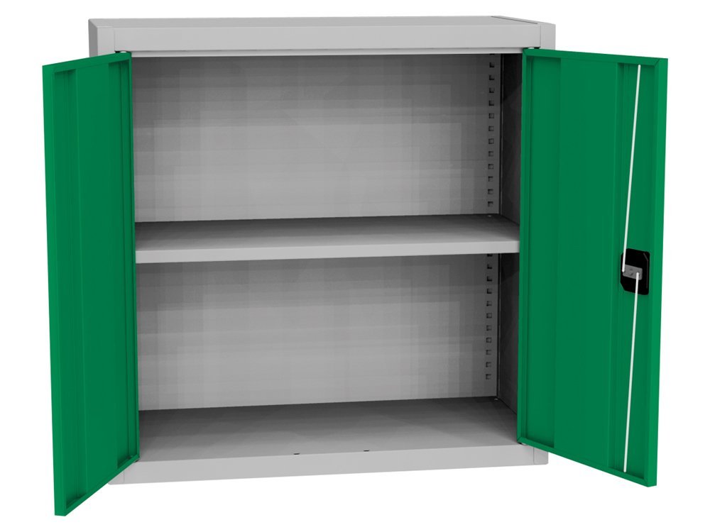 Szafka z drzwiami pełnymi, wysokość 800 x szerokość 505 x głębokość 400 mm. Ryglowanie na zamek bębenkowy z mechanizmem rozstawu osi. 1 x regulowana półka stalowa (nośność 60 kg). Możliwość wymiany drzwi pełnych na drzwi z wypełnieniem szklanym, z wypełnieniem drucianym lub drzwi laminowane w odcieniu buku, brzozy lub wiśni. Kolor korpusu RAL 7035 jasnoszary.