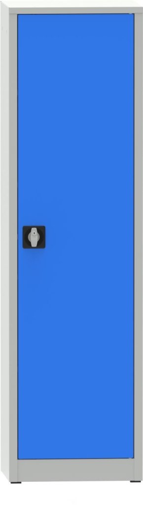 Szafa metalowa spawana, szerokość 508, wysokość 1800, głębokość 400 mm, 4 regulowane półki. Kolor korpusu RAL 7035 jasnoszary, drzwi RAL 7035 jasnoszary i RAL 5012 niebieski.