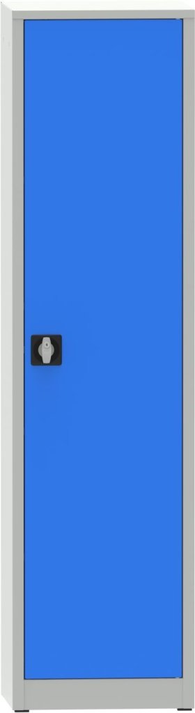 Szafa z drzwiami pełnymi, wysokość 1950 x szerokość 505 x głębokość 400 mm. Ryglowanie na zamek bębenkowy z mechanizmem rozstawu osi. 4 x regulowane półki stalowe (nośność 60 kg). Możliwość wymiany drzwi pełnych na drzwi z wypełnieniem szklanym, z wypełnieniem drucianym lub drzwi laminowane w odcieniu buku, brzozy lub wiśni. Kolor korpusu RAL 7035 jasnoszary.
