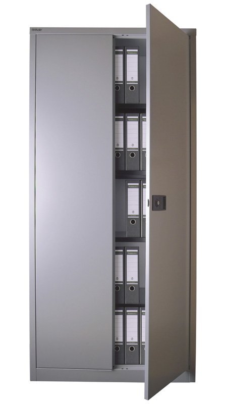 Szafa na dokumenty metalowa dwudrzwiowa z trzema półkami i przegrodą wewnętrzną zamykaną na zamek, szerokość 1000 mm (patrz warianty produktu), wysokość 1990, głębokość 435 mm. Dwupunktowa blokada rozstawu osi, różne kolory.