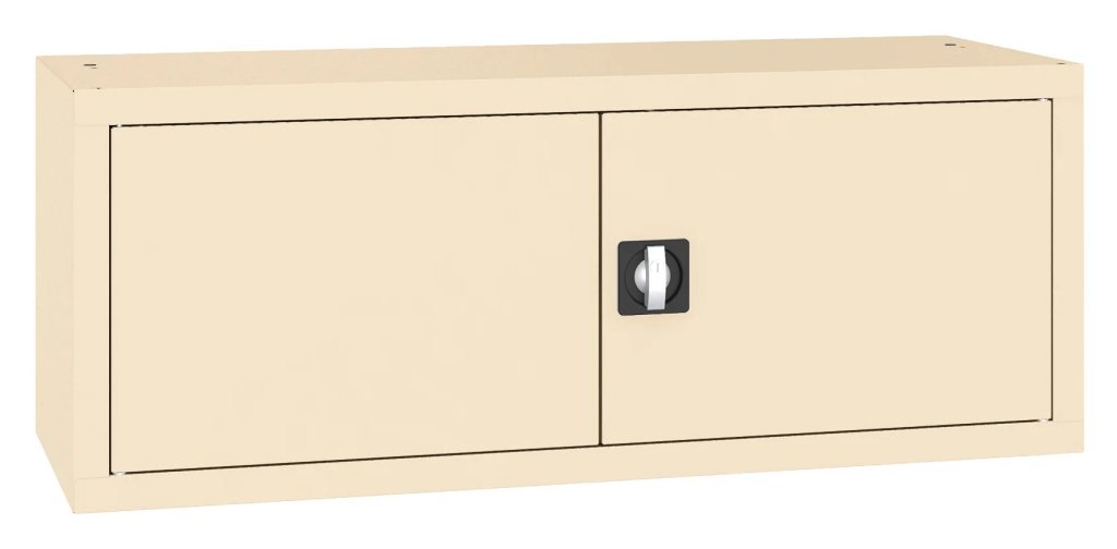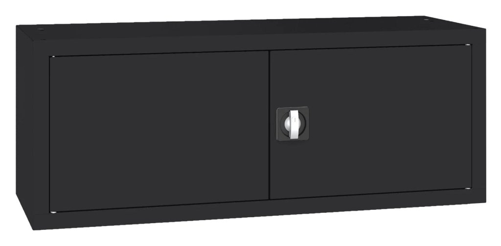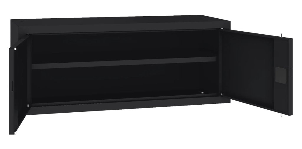 Dwudrzwiowa szafka na dokumenty metalowa z jedną półką, nadająca się jako nadstawka. Szerokość 1200 mm, wysokość 465, głębokość 435 mm. Dwupunktowa blokada rozstawu osi, różne kolory.