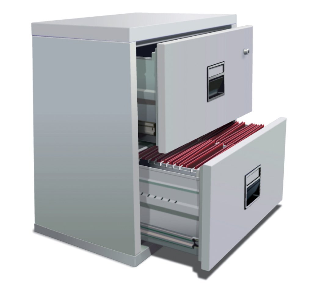 Szafka kartotekowa ognioodporna z dwiema szufladami. Odporność ogniowa zgodnie z UNE-EN 15659 60 minut. Wysokość 825 x szerokość 545 x głębokość 653 mm, kolor jasnoszary. Blokowanie kluczy.