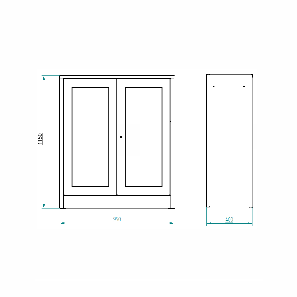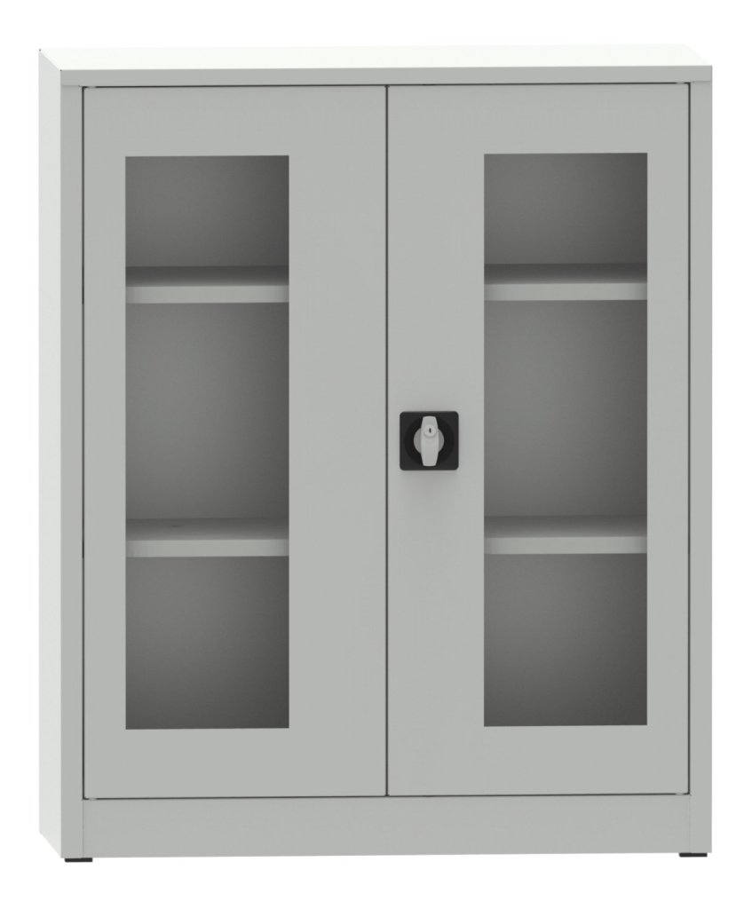Szafka na dokumenty dwudrzwiowa. Wysokość 1150 x szerokość 950 x głębokość 400 mm, 2 półki. Blokada rozstawu osi. Kolor korpusu RAL 7035 jasnoszary. Dostarczany jest zdemontowany – łatwy montaż.