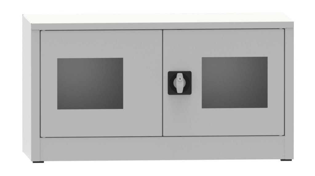Dwudrzwiowa szafka na dokumenty. Wysokość 1150 x szerokość 950 x głębokość 400 mm, 2 półki. Blokada rozstawu osi. Kolor korpusu RAL 7035 jasnoszary. Dostarczany jest zdemontowany – łatwy montaż.