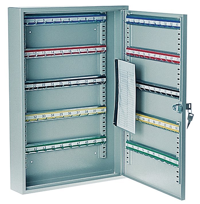 Szafka na klucze typu S 100 na 100 kluczy. Zawiera haczyki z zawieszkami. Zamykana na klucz. Wysokość 550 mm, szerokość 380 mm, głębokość 80 mm. Regulowane drążki z haczykami w zależności od długości kluczy.