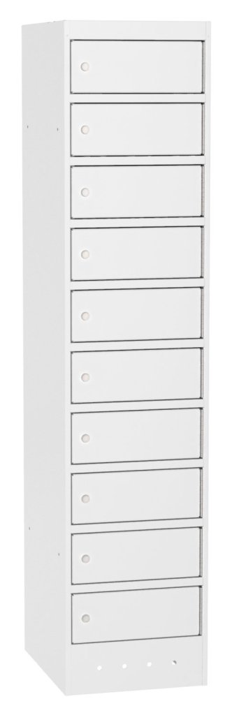 Szafka do przechowywania laptopów. Bez okablowania. Wymiary w mm (wys. x szer. x gł.) 1800 x 400 x 500. 10 szuflad. Zamek bębenkowy lub zamknięcie na kłódkę. Maksymalny rozmiar laptopa, który można przechowywać, to 320 x 450 mm.