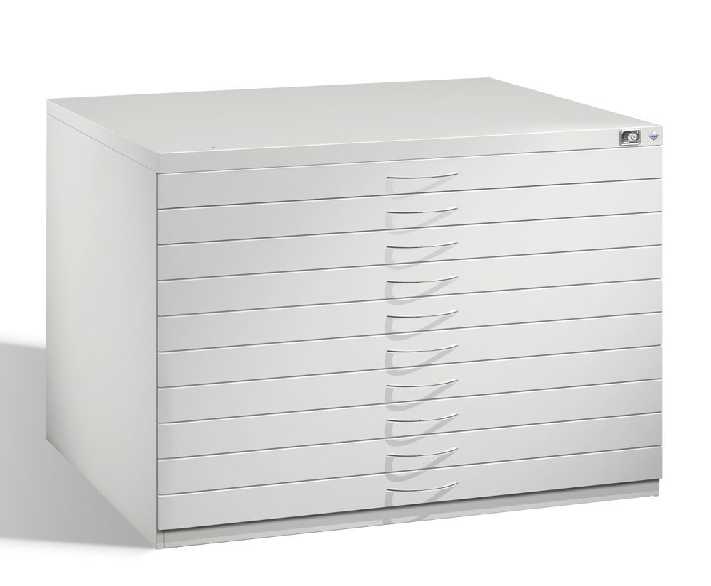 Szafka rysunkowa z 10 szufladami w formacie A1. Wymiary szafki: wysokość 760, szerokość 1100, głębokość 765 mm. Trwała konstrukcja stalowa, centralny zamek na klucz bębenkowy. Nośność szuflady 40 kg. Kolor RAL 7035 jasnoszary.