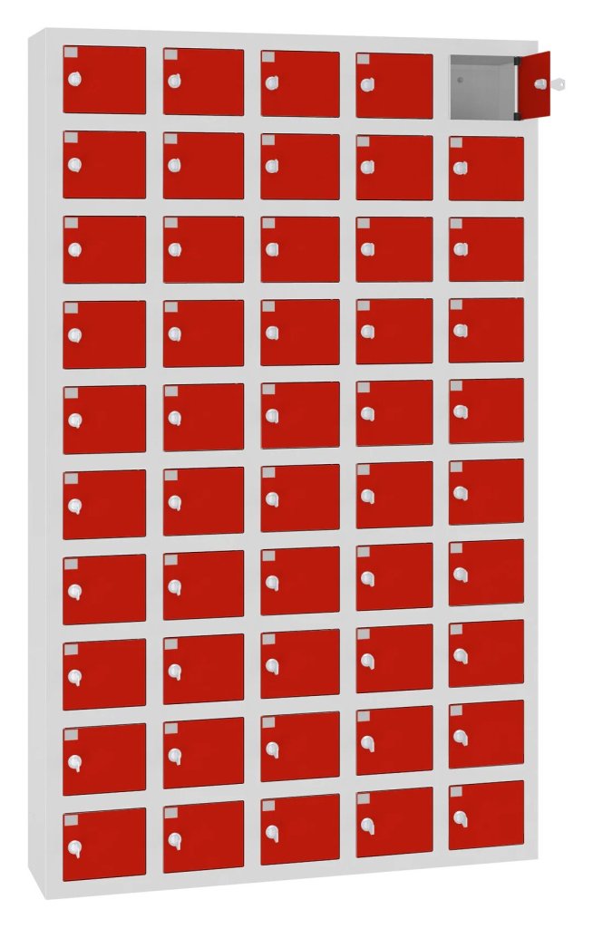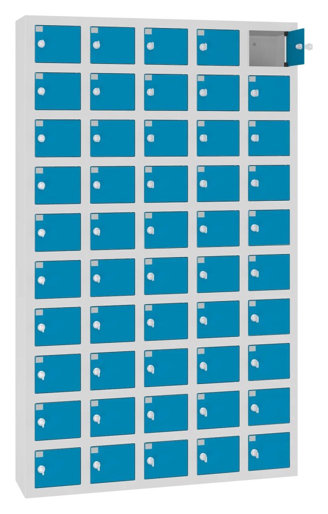 Metalowa szafka ze schowkami do bezpiecznego przechowywania telefonów komórkowych. Przydatna w miejscach pracy czy użyteczności publicznej, w których nie wolno używać telefonu komórkowego. Do wyboru 16 odcieni kolorystycznych wliczonych w cenę. Różne rodzaje zamków.