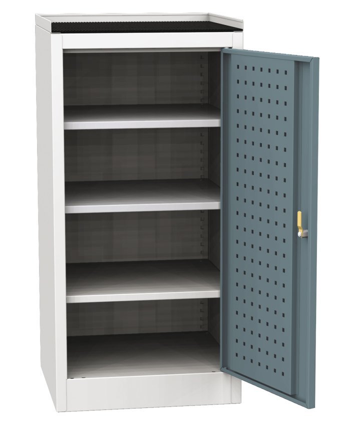 Skrzynka narzędziowa warsztatowa, szerokość 500, wysokość 1030, głębokość 500 mm. Górna część do przechowywania z gumową podkładką i krawędzią zabezpieczającą przed wypadaniem małych przedmiotów. Kolor korpusu szary RAL 7035. W magazynie drzwi w kolorze niebieskim RAL 5012.
