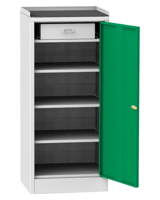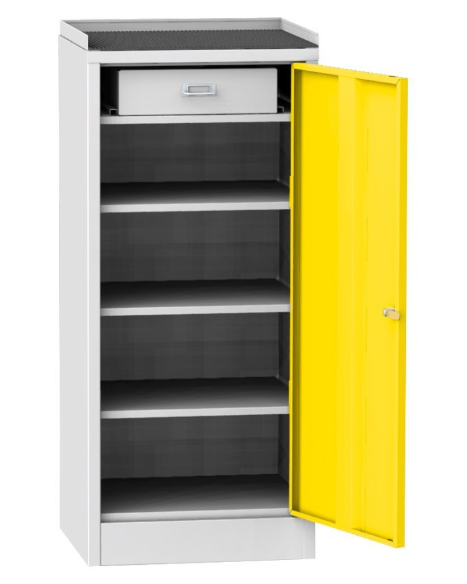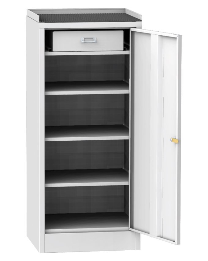 Skrzynka narzędziowa warsztatowa, szerokość 500, wysokość 1030, głębokość 500 mm. Górna część do przechowywania z gumową podkładką i krawędzią zabezpieczającą przed wypadaniem małych przedmiotów. Kolor korpusu RAL 7035 jasnoszary.