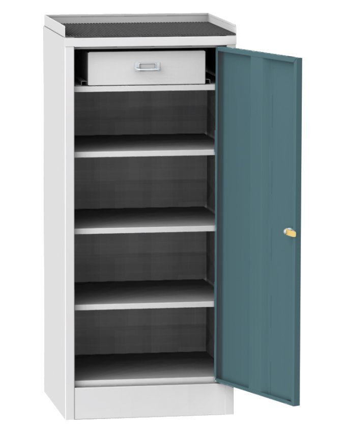 Skrzynka narzędziowa warsztatowa, szerokość 500, wysokość 1030, głębokość 500 mm. Górna część do przechowywania z gumową podkładką i krawędzią zabezpieczającą przed wypadaniem małych przedmiotów. Kolor korpusu szary RAL 7035. W magazynie drzwi w kolorze niebieskim RAL 5012.