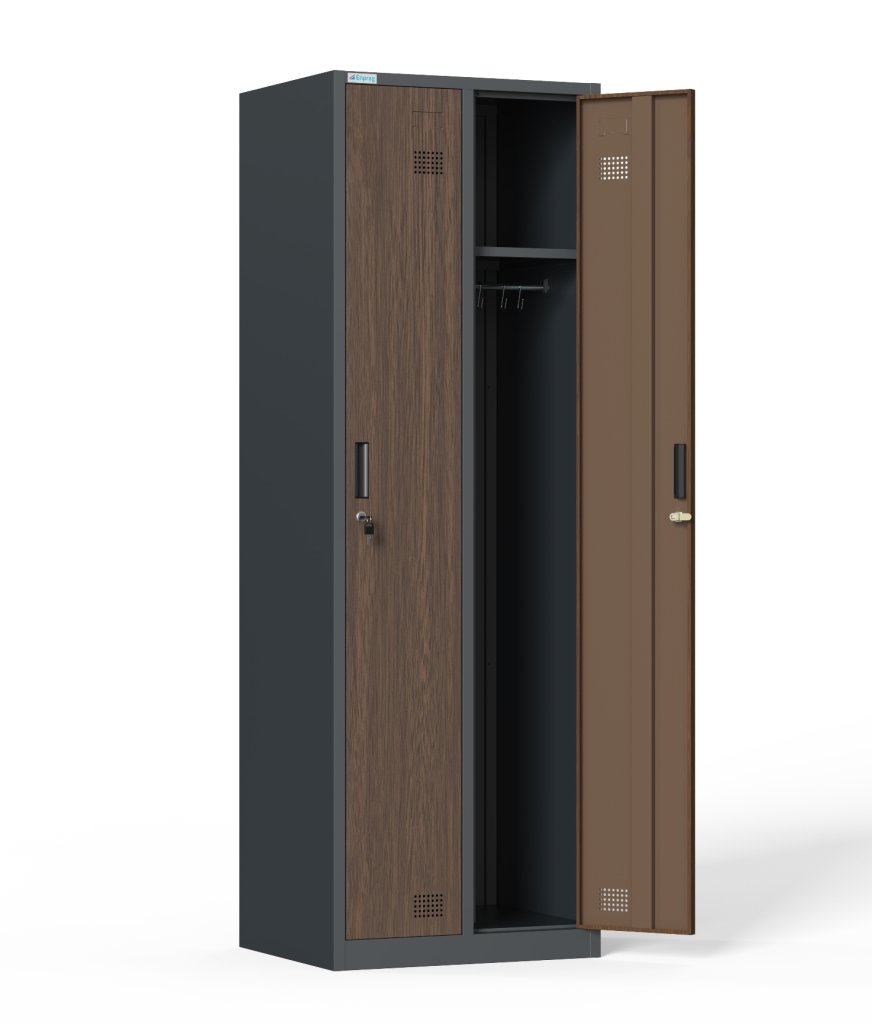 Dwuczęściowa szafa spawana, wysokość 1800 x szerokość 600 x głębokość 493 mm. Zamykanie zamkiem cylindrycznym z dwoma kluczami lub zamkiem obrotowym na kłódkę. Kolor korpusu jasnoszary, drzwi z laminatu HPL w kolorze niebieskim, jasnozielonym lub jasnopomarańczowym. W każdej sekcji znajduje się zagięcie zapobiegające wepchnięciu drzwi do środka i otwarciu zamka.