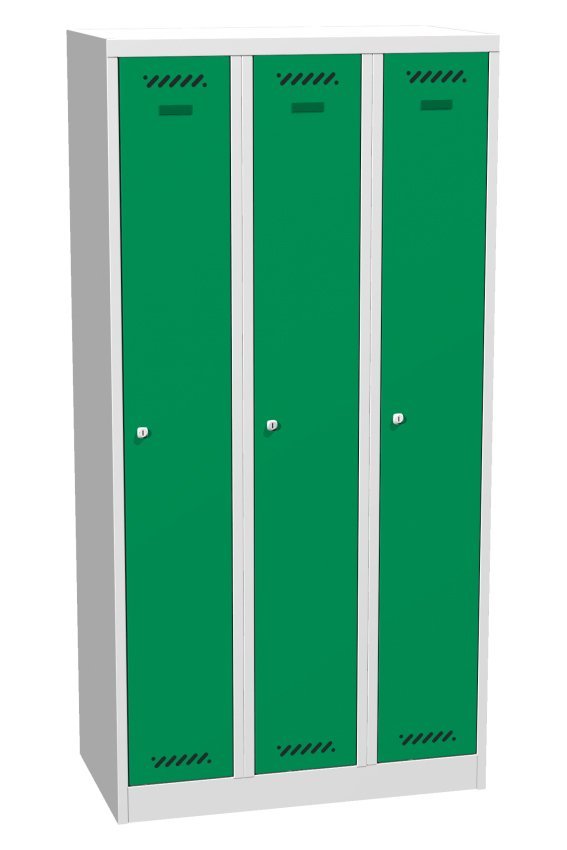 Szafka metalowa BHP trzykomorowa, spawana. Szerokość 900 mm, szerokość przedziału 300 mm, wysokość 1800 mm, głębokość 500 mm. Z zamkiem cylindrycznym i dwoma kluczami lub z zamkiem obrotowym na kłódkę. Kolor korpusu jasnoszary, kolor drzwi - szary, niebieski, czerwony, zielony lub żółty. W każdej komorze znajduje się zagięcie zapobiegające wepchnięciu drzwi do środka i otwarciu zamka.