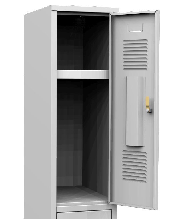 Szafkia metalowa dwudrzwiowa, dzielona, szerokość 300, wysokość 1850, głębokość 500 mm, w górnej części każdego schowka znajduje się półka oraz drążek z trzema plastikowymi haczykami przesuwnymi. Kolor korpusu RAL 7035 jasnoszary.