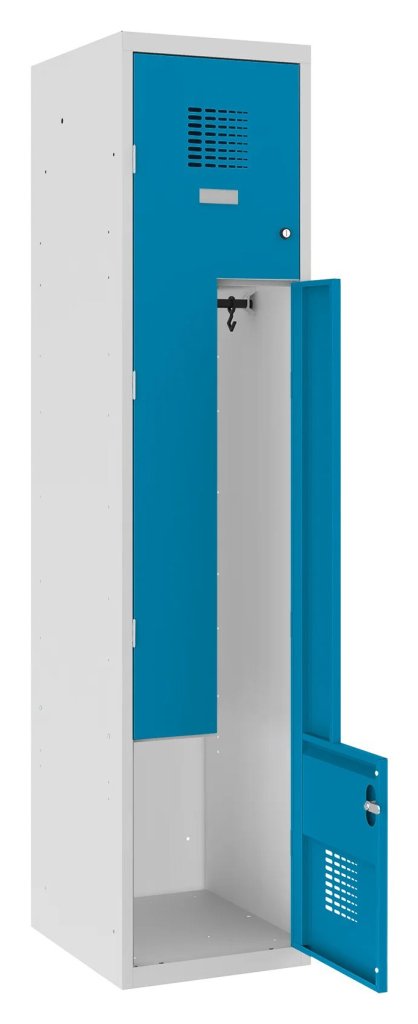 Szafka metalowa pracownicza dwudrzwiowa o konstrukcji spawanej i nowoczesnej konstrukcji systemu wentylacji. Idealny do małych pomieszczeń. Wysokość 1800 x szerokość 400 x głębokość 500 mm. Standardowe wyposażenie szafki: drążek z haczykami, plakietka samoprzylepna. Do wyboru 16 odcieni kolorów. Zamek bębenkowy lub zamknięcie na kłódkę.