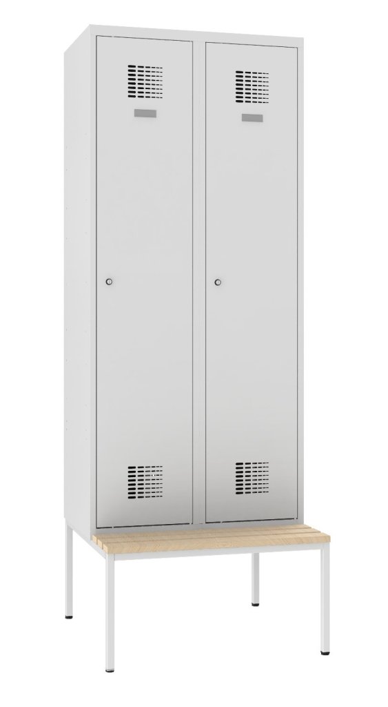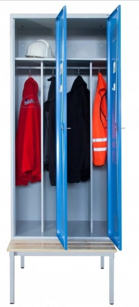 Szafka metalowa BHP dwudrzwiowa z ławką i nowoczesnym designem systemu wentylacji. Wysokość 2190 x szerokość 800 x głębokość 500 mm. Standardowe wyposażenie szafki: wewnętrzna przegroda do oddzielania prania czystego i brudnego, drążek z dwoma haczykami, wieszak na ręcznik, lustro, półka nad drążkiem, samoprzylepna plakietka na imię. Zamek bębenkowy lub zamknięcie na kłódkę.