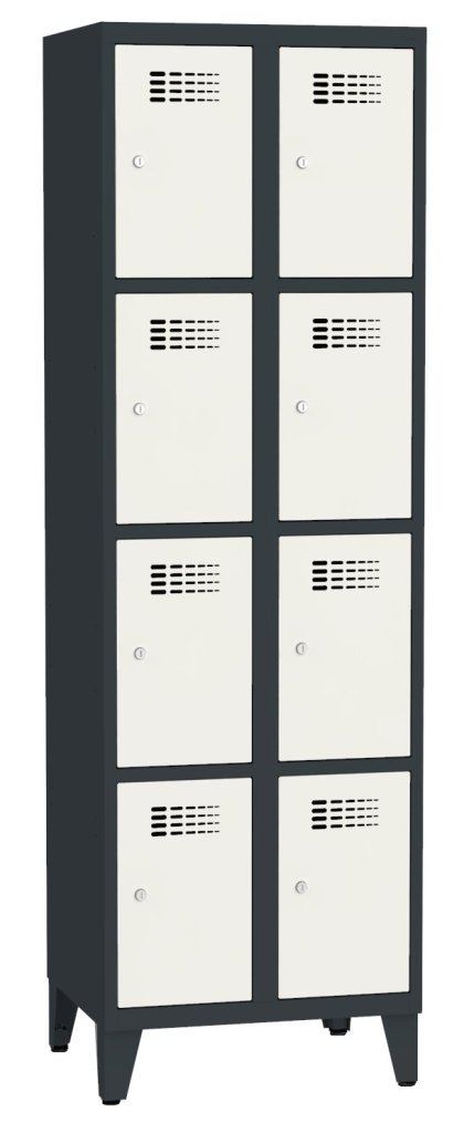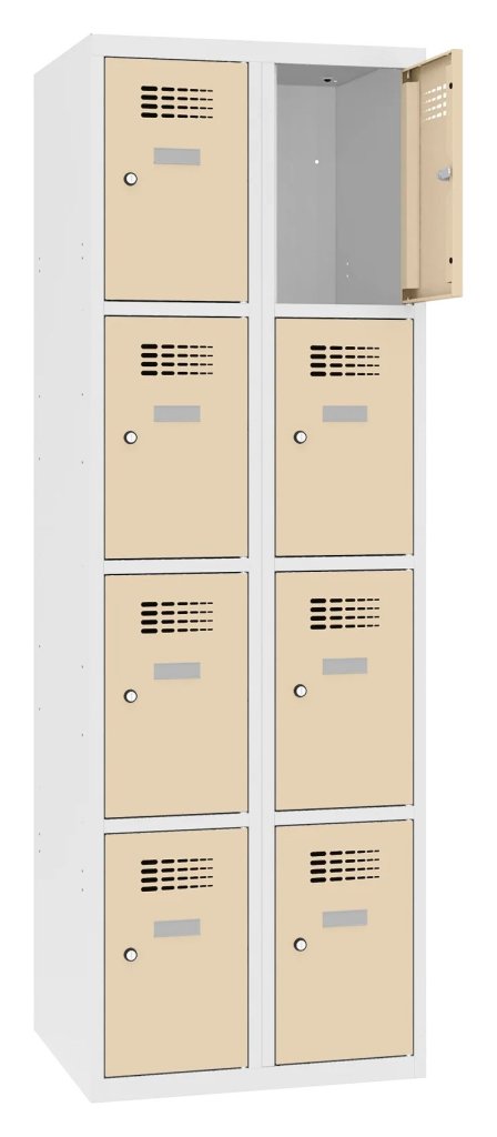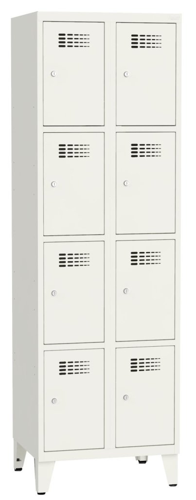 Czterodrzwiowa szafka metalowa o konstrukcji spawanej z nowoczesnym systemem wentylacji. 4 schowki. Wysokość 1800 x szerokość 300 x głębokość 500 mm. Samoprzylepna plakietka imienna na drzwiach. Do wyboru 16 odcieni kolorystycznych wliczonych w cenę. Różne rodzaje zamykania.