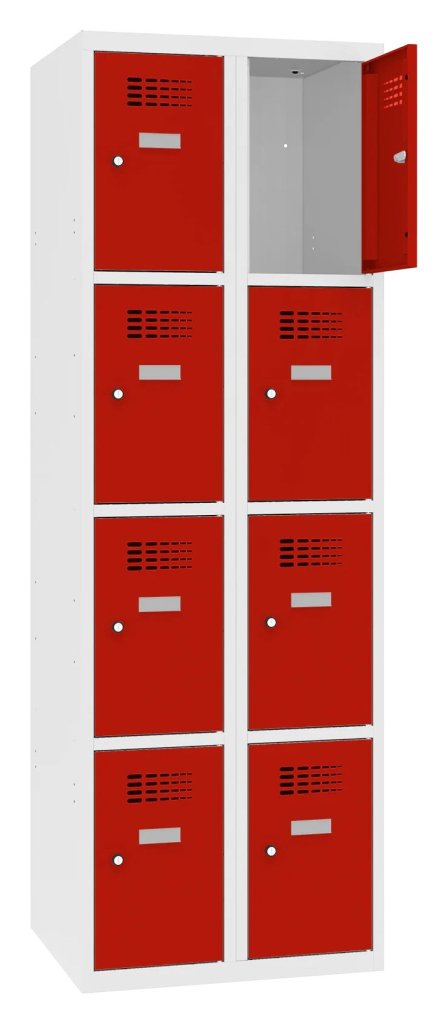 Szafka metalowa BHP ośmiodrzwiowa o konstrukcji spawanej z nowoczesnym systemem wentylacji. Wysokość 1800 x szerokość 600 x głębokość 500 mm. Samoprzylepna plakietka imienna na drzwiach. Do wyboru 16 odcieni kolorystycznych bez dopłaty. Różne rodzaje zamków.