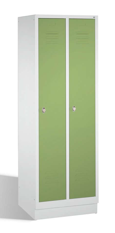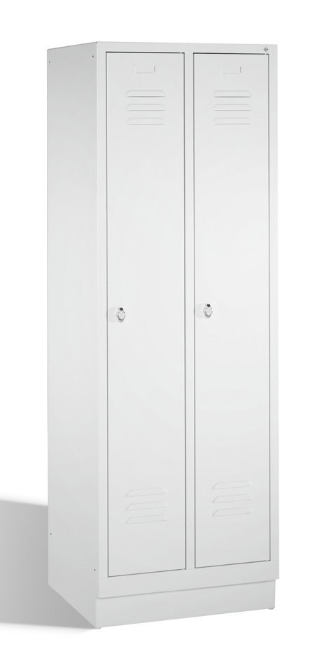 Szafka BHP pracownicza metalowa, dwudrzwiowa, na cokole, szerokość 500, wysokość 1850, głębokość 500 mm. Kolor korpusu RAL 7035 jasnoszary.