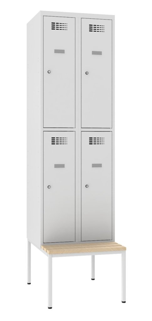 Szafka metalowa BHP czterodrzwiowa z ławką i nowoczesnym designem systemu wentylacji. Wysokość 2190 x szerokość 600 x głębokość pełny opis i parametry
