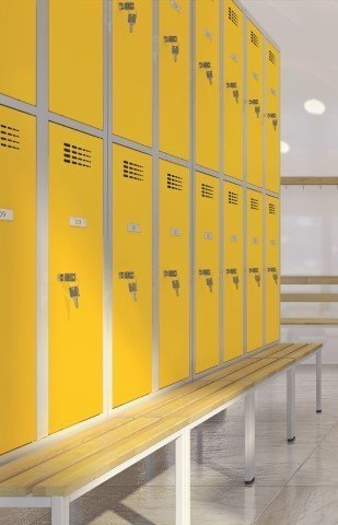 Szafka metalowa BHP czterodrzwiowa z ławką i nowoczesnym designem systemu wentylacji. Wysokość 2190 x szerokość 600 x głębokość 500 mm. Wyposażenie standardowe: drążek z haczykami, samoprzylepna plakietka z imieniem. Do wyboru 16 odcieni kolorystycznych wliczonych w cenę bez dopłaty. Różne rodzaje blokowania.