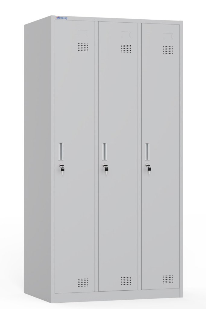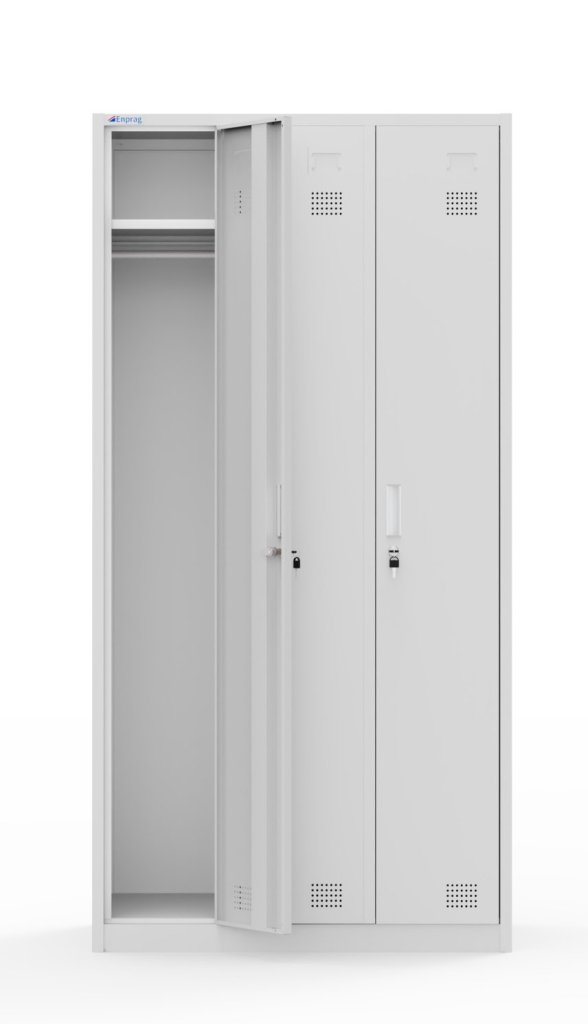 Dwuczęściowa szafa spawana, wysokość 1800 x szerokość 600 x głębokość 493 mm. Zamykanie zamkiem cylindrycznym z dwoma kluczami lub zamkiem obrotowym na kłódkę. Kolor korpusu jasnoszary, drzwi z laminatu HPL w kolorze niebieskim, jasnozielonym lub jasnopomarańczowym. W każdej sekcji znajduje się zagięcie zapobiegające wepchnięciu drzwi do środka i otwarciu zamka.