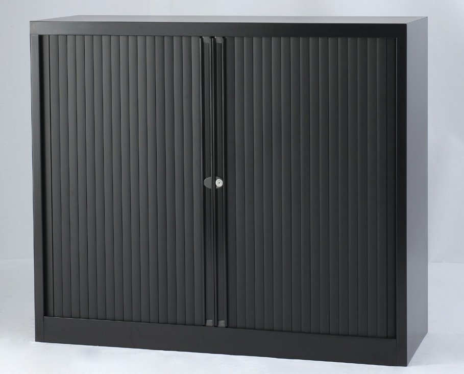Szafka roletowa metalowa z roletami poziomymi z dwiema półkami, szerokość 1200, wysokość 1030, głębokość 430 mm, różne kolory.