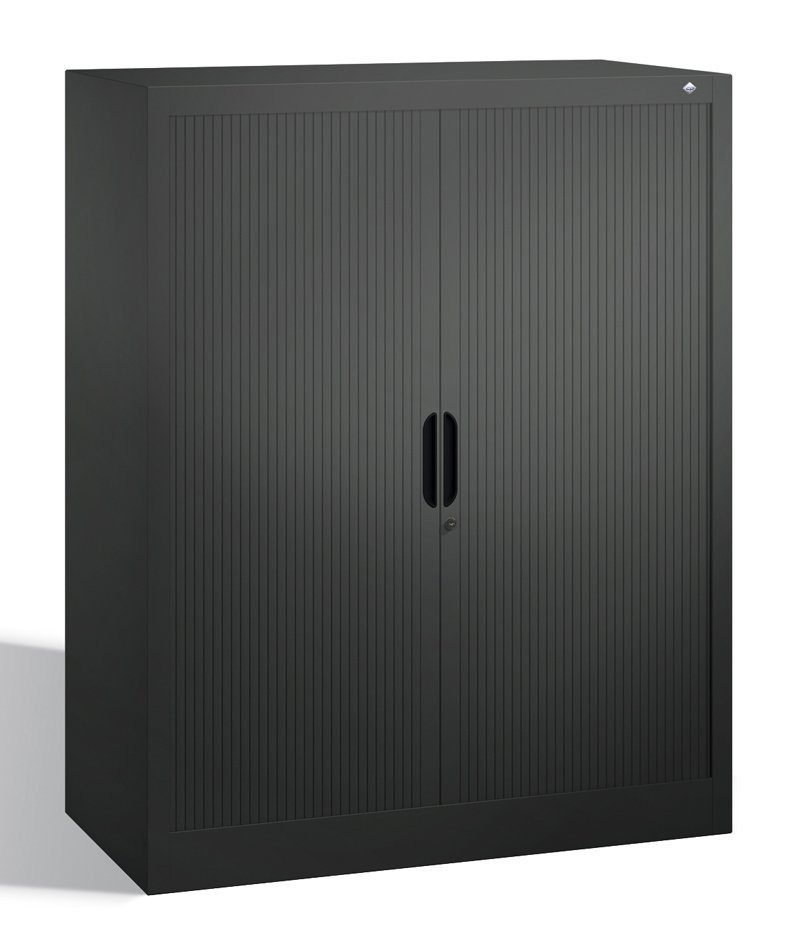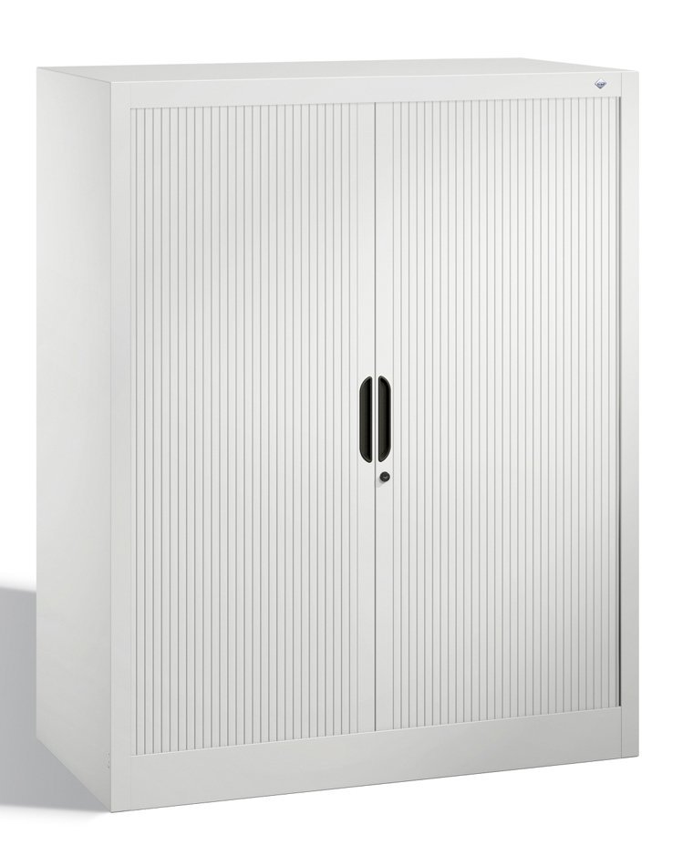 Metalowa szafka żaluzjowa dwudrzwiowa. Wysokość 1230, szerokość 1000, głębokość 420 mm. 2 półki. Kolor korpusu i żaluzji jasnoszary RAL 7035/antracyt RAL 7021.