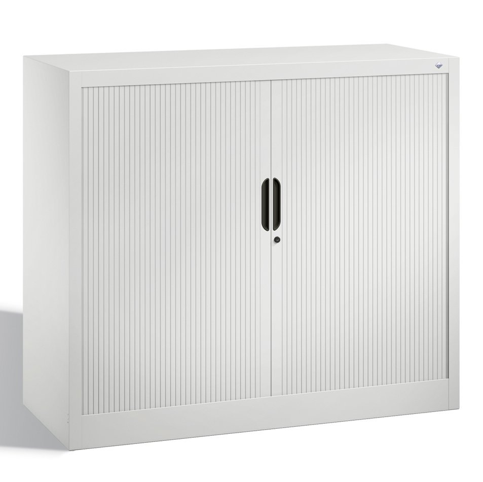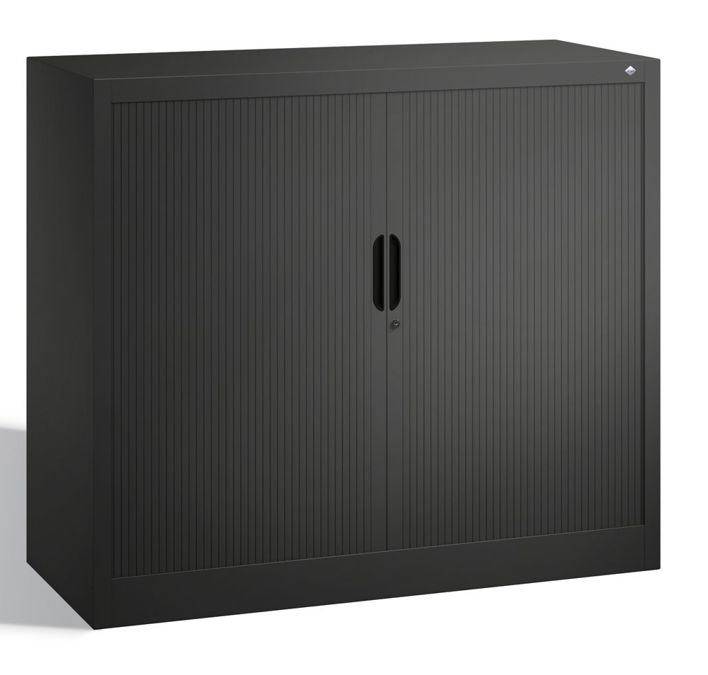 Metalowa szafka roletowa, dwudrzwiowa. Wysokość 1030, szerokość 1200, głębokość 420 mm. 2 półki. Kolor korpusu i żaluzji jasnoszary RAL 7035/antracyt RAL 7021.