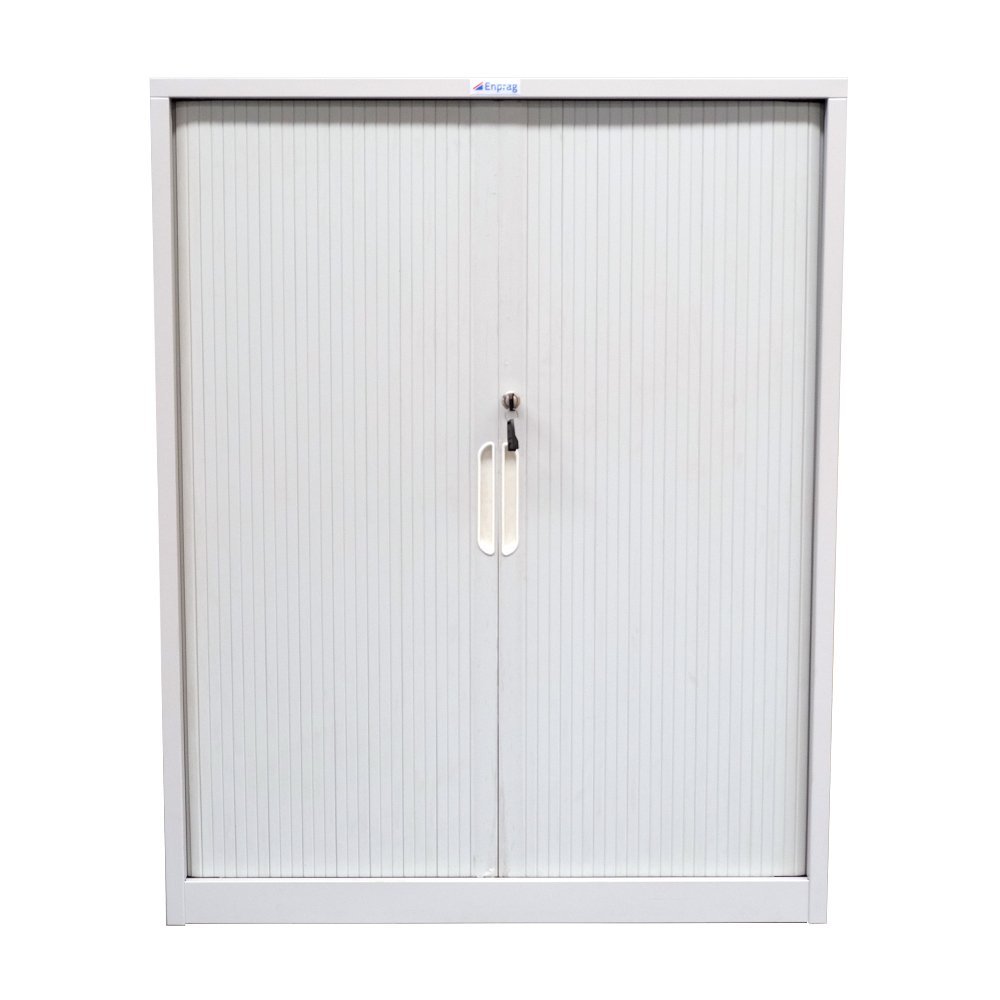 Dwudrzwiowa szafka biurowa metalowa, demontowana, wykonana z blachy stalowej o grubości 0,6 mm. Wysokość 1130 x szerokość 900 x głębokość 390 mm, 2 x półki, zamek bębenkowy z dwoma kluczami. Obróbka powierzchni farbą proszkową - korpus w kolorze ciemnoszarym, drzwi białe.