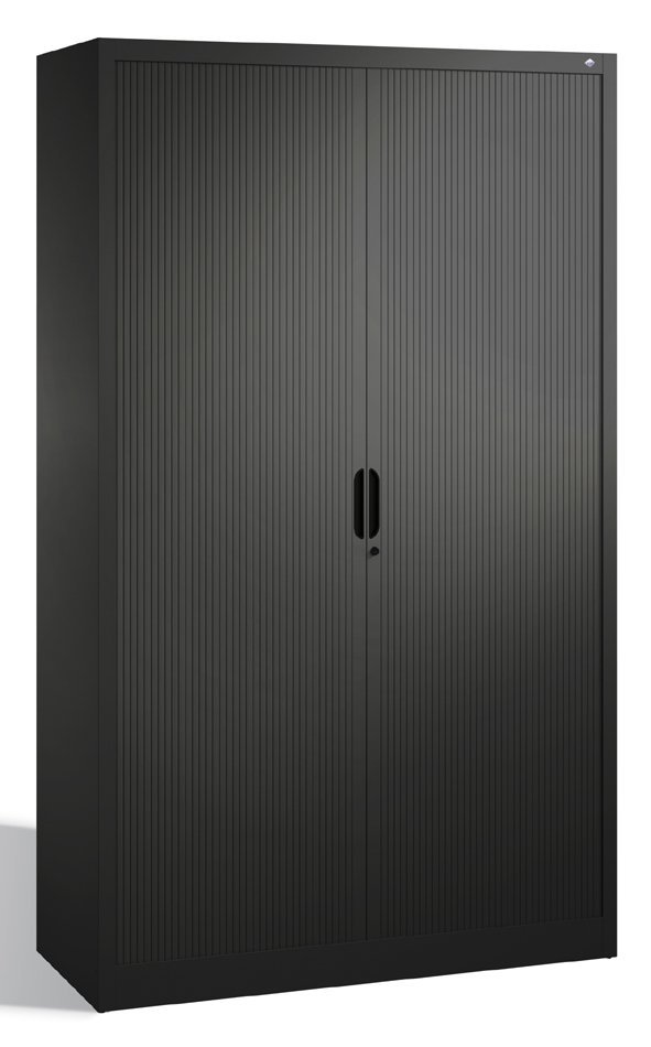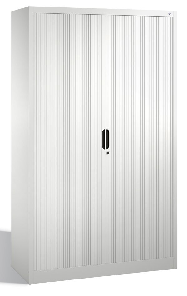 Metalowa szafa roletowa, dwudrzwiowa. Wysokość 1980, szerokość 1200, głębokość 420 mm. Cztery półki. Kolor korpusu i żaluzji jasnoszary RAL 7035/antracyt RAL 7021.