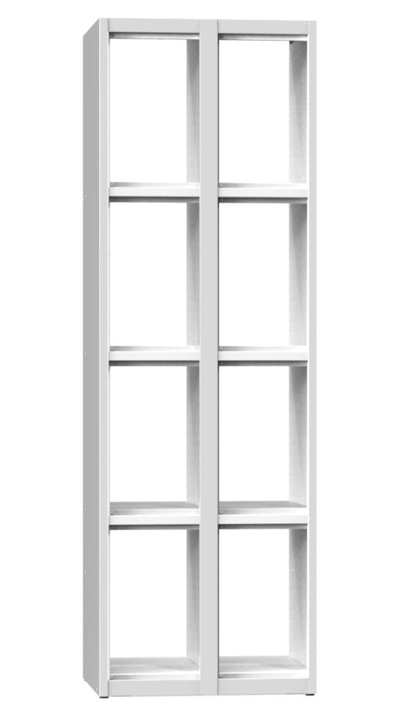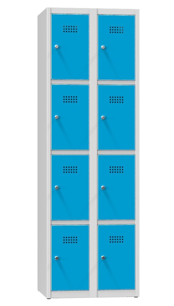 Szafka metalowa z ośmioma zamykanymi schowkami, szerokość 600, wysokość 1850, głębokość 500 mm. Szerokość schowka - 300 mm, standardowy zamek można zastąpić kłódką lub zamkiem na monety. Kolor korpusu RAL 7035 jasnoszary.