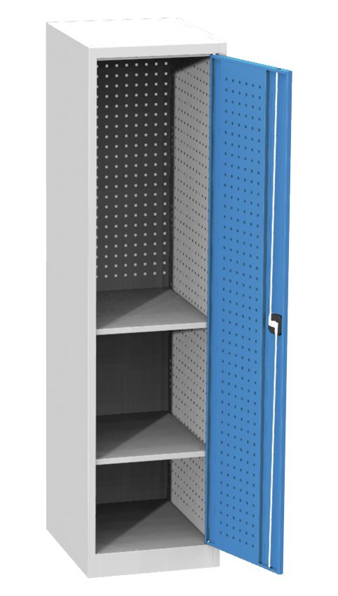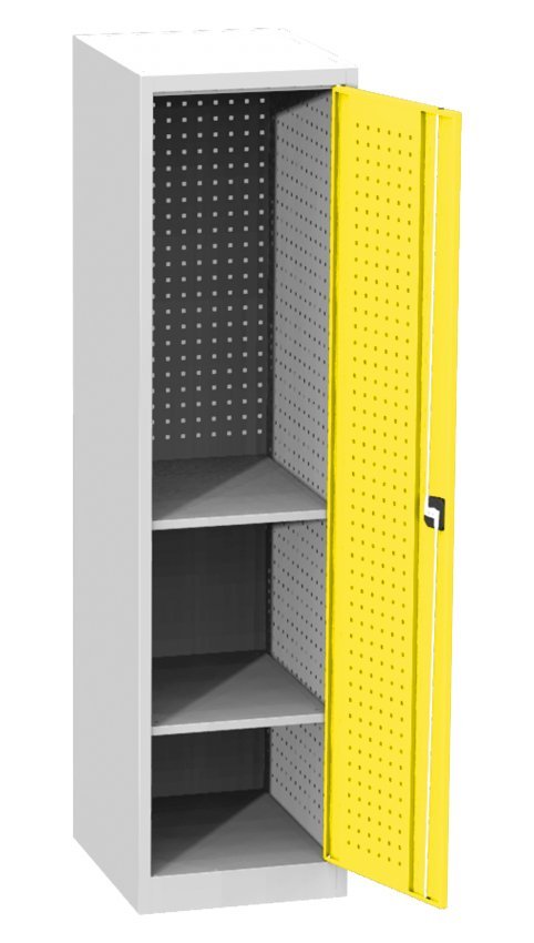 Szafa warsztatowa jednodrzwiowa, szerokość 505, wysokość 1950, głębokość 600 mm, 2 półki. Możliwość wymiany drzwi pełnych na ramę ze szkła hartowanego lub siatki drucianej dla lepszego przeglądu zawartości szafki. Nośność korpusu 800 kg, pojemność półki 100 kg. Kolor korpusu RAL 7035 jasnoszary.