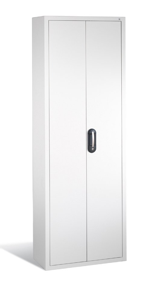 Uniwersalna szafa warsztatowa z drzwiami skrzydłowymi, 4 półki (ocynkowane) regulowane w rastrze 25 mm, nośność 400 kg. Wysokość 1950, szerokość 950, głębokość 400 mm. Drzwi pełne można zastąpić drzwiami szklanymi. Na stanie w kolorze nadwozia szarym RAL 7035 i drzwiach niebieskich RAL 5012.