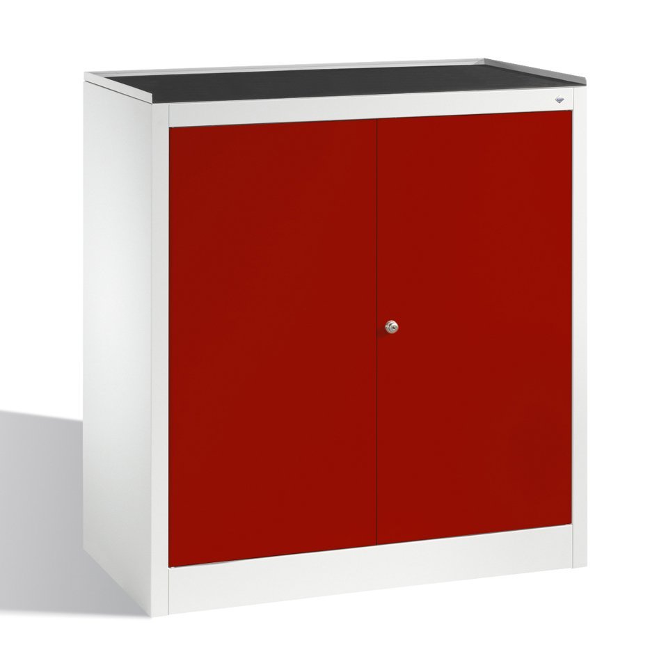 Dwudrzwiowa szafa warsztatowa o trwałej konstrukcji stalowej. 1x regulowana półka ocynkowana, nośność 70 kg/półkę. W górnej części szafki znajduje się ryflowana podkładka gumowa. Cylindryczny zamek bezpieczeństwa z uchwytem. Dostępne wymiary w mm (wys. x szer. x gł.) 1000 x 930/1200 x 500.