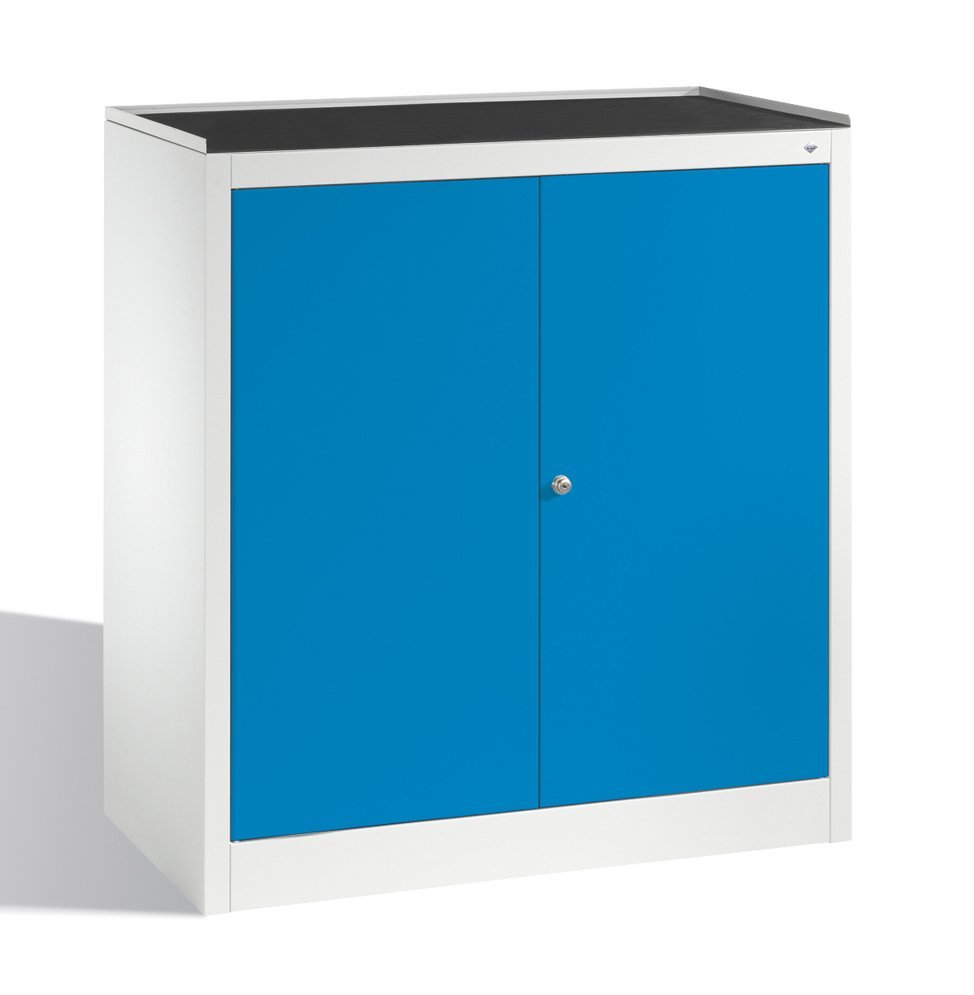Szafa warsztatowa dwudrzwiowa, szerokość 950, wysokość 1180, głębokość 600 mm, 2 półki. Możliwość wymiany drzwi pełnych na ramę ze szkła hartowanego lub siatki drucianej dla lepszego przeglądu zawartości szafki. Nośność korpusu 800 kg, pojemność półki 100 kg. Kolor korpusu RAL 7035 jasnoszary. Na magazynie w wersji pełnej, kolor drzwi niebieski RAL 5012.