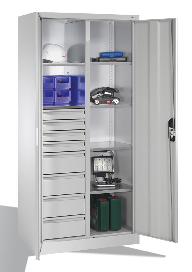 Szafa warsztatowa dwudrzwiowa, szerokość 950, wysokość 1950, głębokość 600 mm, 1 półka, 8 szuflad. Możliwość wymiany drzwi pełnych na drzwi z wypełnieniem szklanym lub drucianym. Kolor korpusu RAL 7035 jasnoszary.