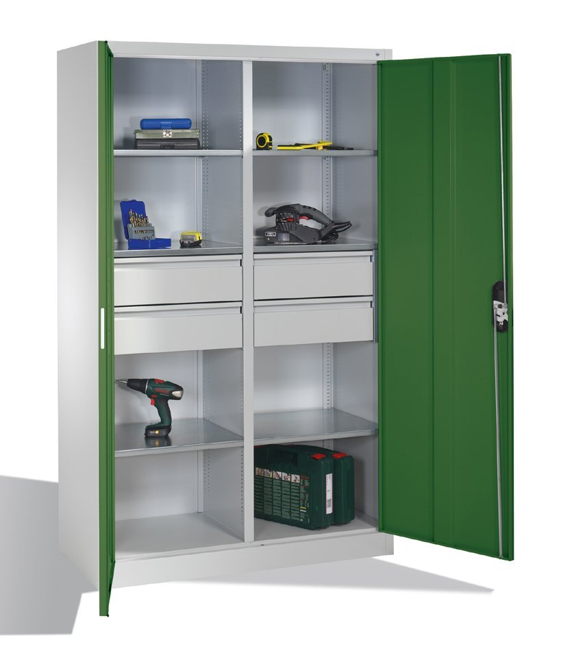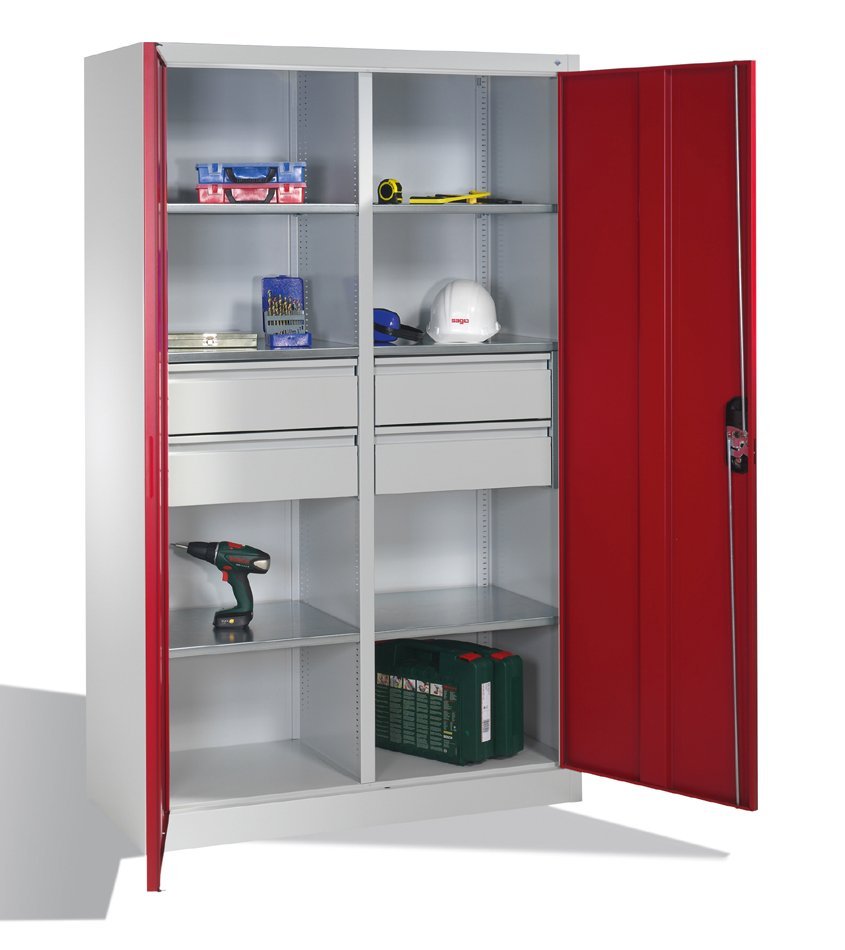 Szafa warsztatowa dwudrzwiowa, szerokość 950, wysokość 1950, głębokość 600 mm, 2 półki, 4 szuflady. Możliwość wymiany drzwi pełnych na drzwi z wypełnieniem szklanym lub drucianym. Kolor korpusu szary RAL 7035. W magazynie drzwi w kolorze niebieskim RAL 5012.