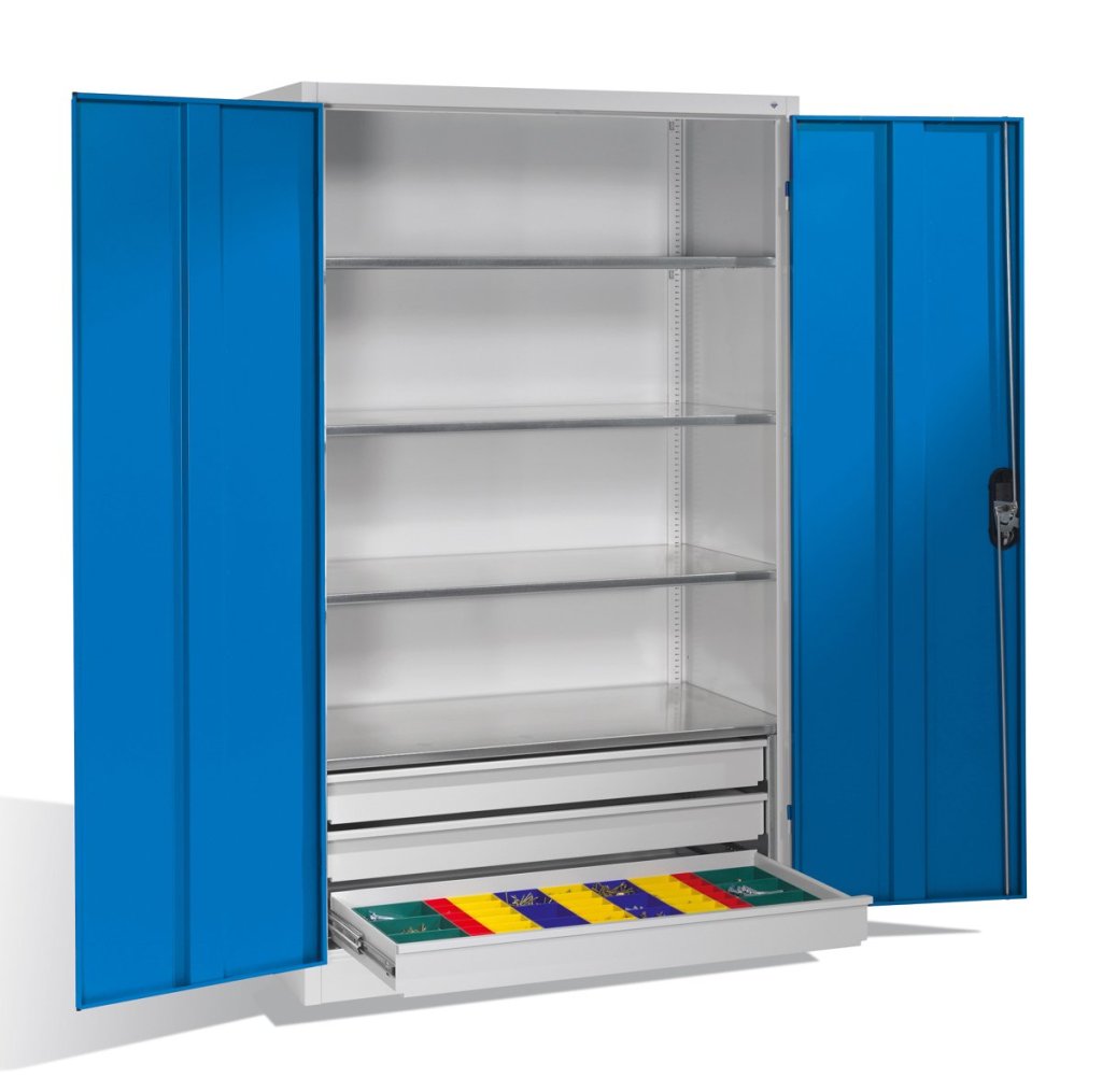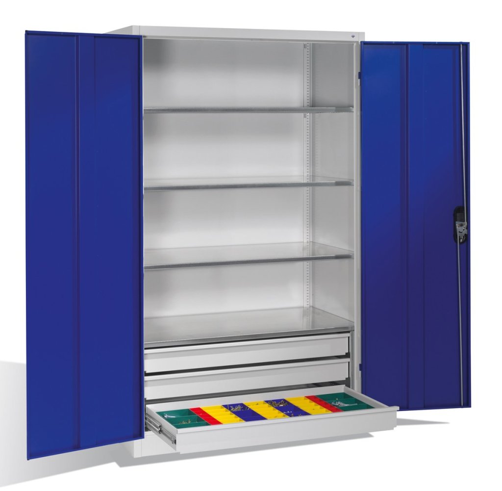 Szafa warsztatowa dwudrzwiowa, szerokość 950, wysokość 1950, głębokość 600 mm, 2 półki, 4 szuflady. Możliwość wymiany drzwi pełnych na drzwi z wypełnieniem szklanym lub drucianym. Kolor korpusu szary RAL 7035. W magazynie drzwi w kolorze niebieskim RAL 5012.